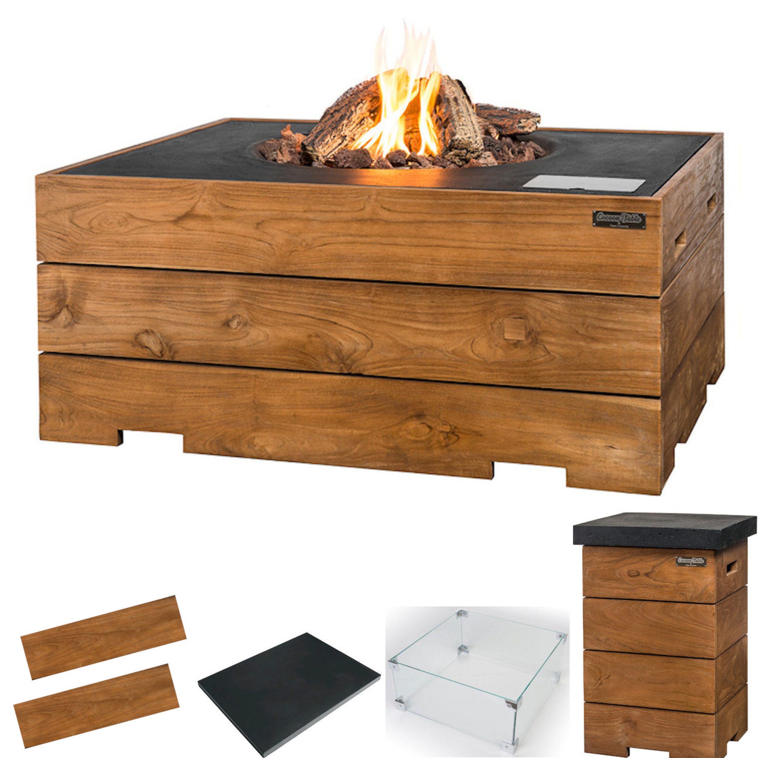 Genießen Sie schöne Stunden zu zweit an einem gemütlichen Feuer ganz ohne das kontinuierliche Nachlegen von Holz oder den teilweise störenden Rauch. Die Feuerstellen von Mania Happy Cocooning sorgen auf Knopfdruck für eine angenehme und behagliche Wohlfühl-Atmosphäre. Die Feuerstellen sind aus hochwertigem Teakholz mit einer Tischplatte aus wetterfestem Verbundstoff in Beton-Optik gefertigt und können das ganze Jahr über draußen stehen. Das praktische Komplettset bietet Ihnen zusätzlich zum Feuertisch ein vielfältiges Zubehörpaket mit schützendem Glasschirm, Deckel für den Feuertisch, zwei Seitentischen und dem Beistelltisch Enclosure, in dem die Gasflasche verstaut werden kann.