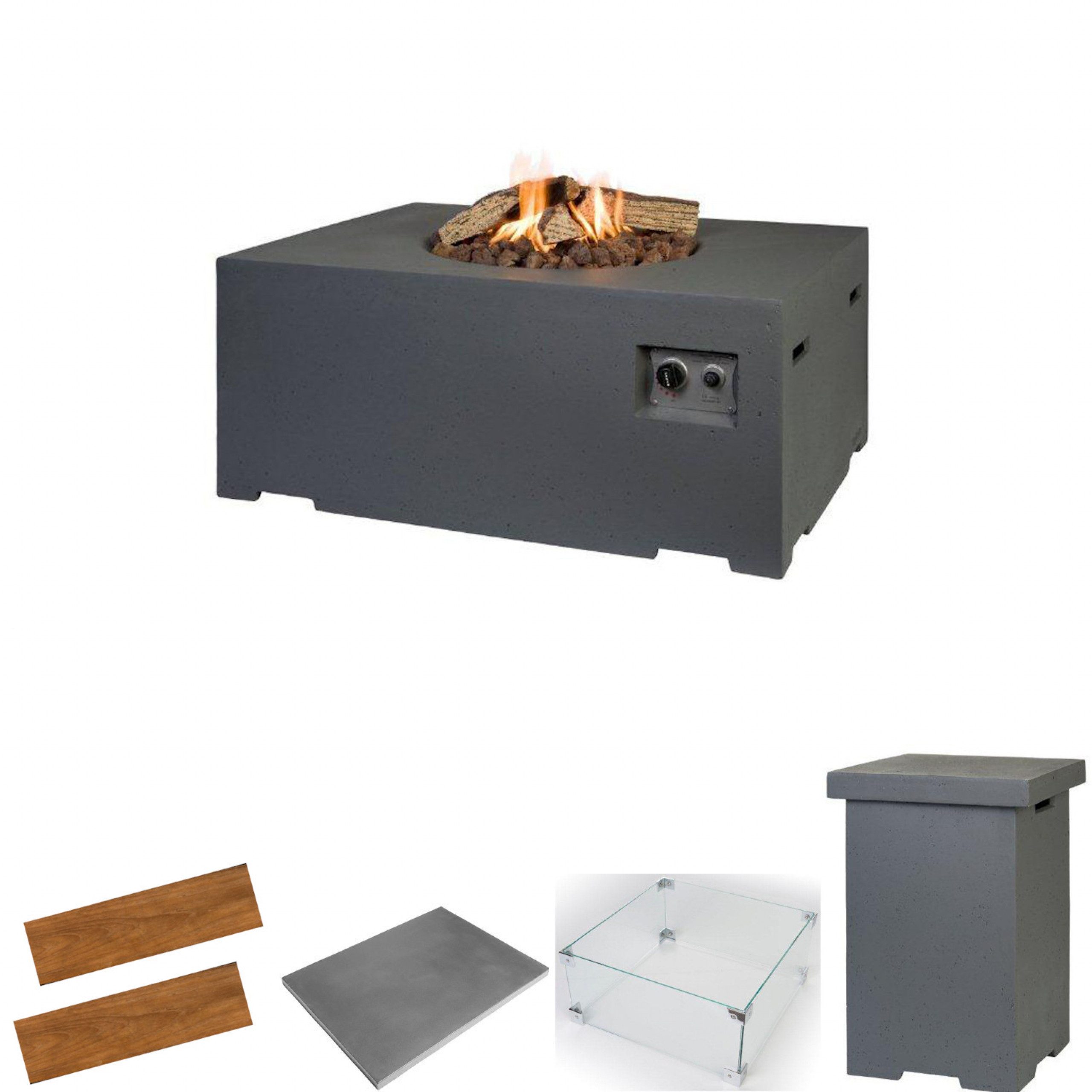 Genießen Sie schöne Stunden zu zweit an einem gemütlichen Feuer ganz ohne das kontinuierliche Nachlegen von Holz oder den teilweise störenden Rauch. Die Feuerstellen von Mania Happy Cocooning sorgen auf Knopfdruck für eine angenehme und behagliche Wohlfühl-Atmosphäre. Die Feuerstellen sind aus wetterfestem Verbundstoff in Beton-Optik gefertigt und können das ganze Jahr über draußen stehen. Das praktische Komplettset bietet Ihnen zusätzlich zum Feuertisch ein vielfältiges Zubehörpaket mit schützendem Glasschirm, Deckel für den Feuertisch, zwei Seitentischen und dem Beistelltisch Enclosure, in dem die Gasflasche verstaut werden kann.