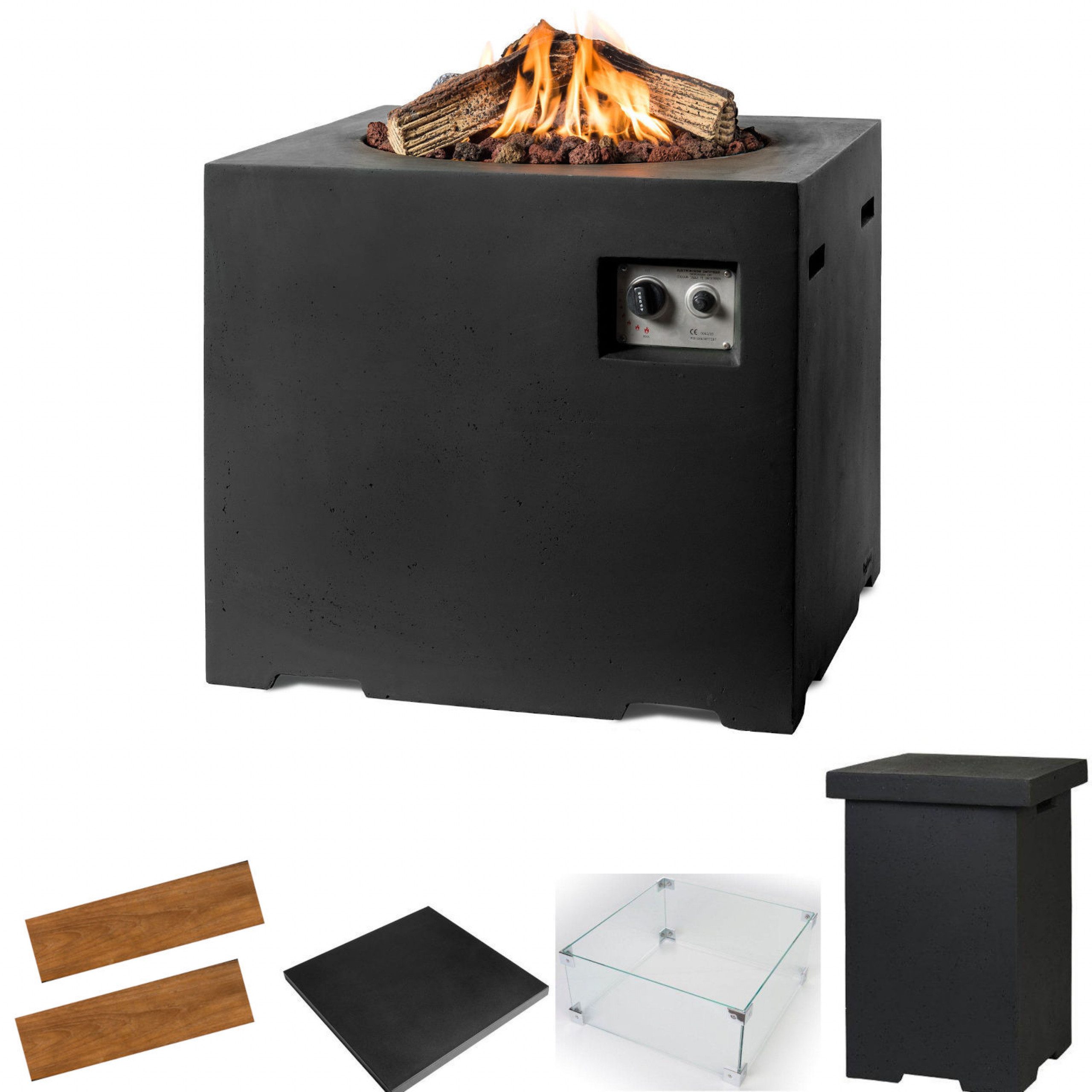 Genießen Sie schöne Stunden zu zweit an einem gemütlichen Feuer ganz ohne das kontinuierliche Nachlegen von Holz oder den teilweise störenden Rauch. Die Feuerstellen von Mania Happy Cocooning sorgen auf Knopfdruck für eine angenehme und behagliche Wohlfühl-Atmosphäre. Die Feuerstellen sind aus wetterfestem Verbundstoff in Beton-Optik gefertigt und können das ganze Jahr über draußen stehen. Das praktische Komplettset bietet Ihnen zusätzlich zum Feuertisch ein vielfältiges Zubehörpaket mit schützendem Glasschirm, Deckel für den Feuertisch, zwei Seitentischen und dem Beistelltisch Enclosure, in dem die Gasflasche verstaut werden kann.