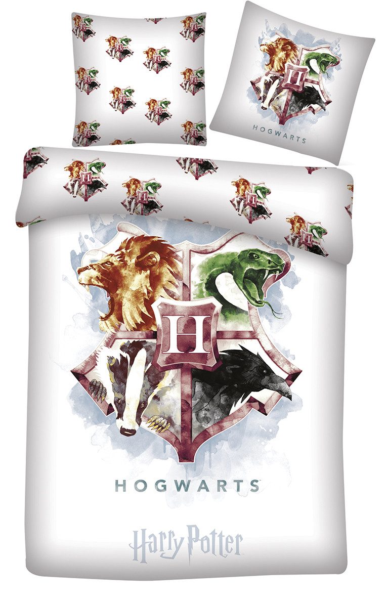 Die Hogwarts Schule für Hexerei und Zauberei ist ein Internat für Kinder, die mit magischen Kräften ausgestattet sind. Und das Wappen von Hogwarts aus dem Kinohit Harry Potter besteht aus einem Buchstaben H um den in einem Kreis ein Löwe, ein Adler, ein Dachs und eine Schlange zu sehen sind. Aufgrund der weltweiten Bekanntheit ziert das Wappen mittlerweile unzählige Textilwaren, wie auch diese Bettwäsche. Babys, Kleinkinder und Erwachsene werden bei dieser Bettwäsche strahlende Augen bekommen! Diese tolle Bettwäsche auf der das Wappen von Hogwarts abgebildet ist, wird in jedem Kinderzimmer zum Hingucker. So wird aus einem langweiligen Bett ein Rückzugsort. Das leichte Material der Bettdecke und Kopfkissen ist angenehm kuschelig und weich, so dass die Kids sich wunderbar einkuscheln können. Dieses Bettwäsche-Set ist ein absolutes Muss für kleine und große Fans von Harry Potter und seine magische Welt. Das Set besteht aus einem Kopfkissen-Bezug 60 x 63 cm und einem Decken-Bezug 140 x 200 cm. Auf der Bettwäsche und Kopfkissen ist das berühmte Wappen von Hogwarts mit der Aufschrift "Hogwarts" und "Harry Potter" abgebildet, welches nicht nur Harry Potter-Fans verzaubern wird. Die Tiere der Häuser Schlange für Slytherin, Löwe für Gryffindor, Dachs für Hufflepuff und Adler für Ravenclaw sind malerisch dargestellt. Die edlen Farben des Wappen und der Hintergrund machen diese Bettwäsche zu etwas Besonderem!