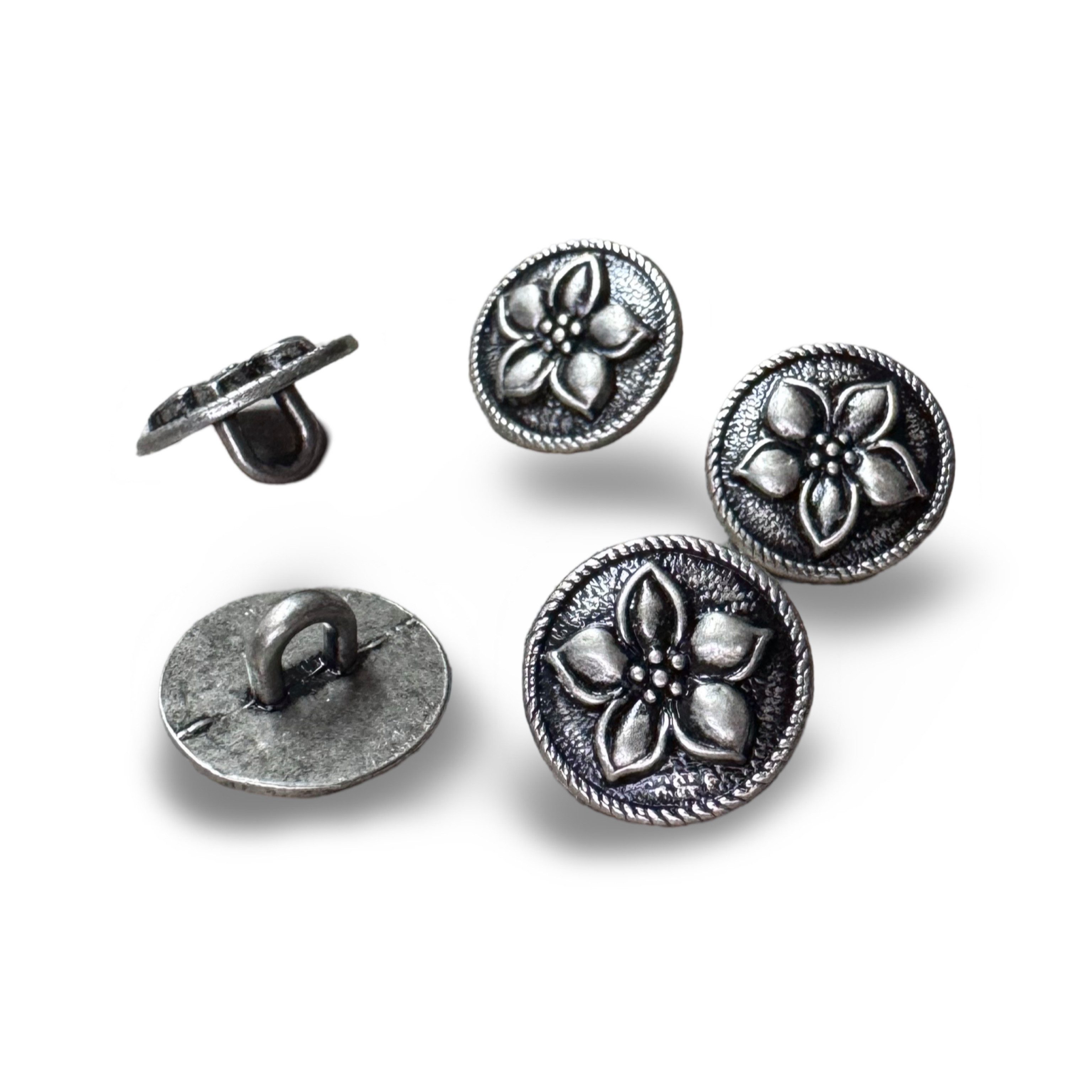zauberhafte, kleine, altsilberne Metall Knöpfe, flache Form, Motiv erhöht hübsches Blütenmotiv, Blume, Enzian hochwertige Knöpfe, Vollmetall, teilweise geschwärzt Größen: 12mm oder 15mm Lieferumfang: 1 Set = 10 Knöpfe Hergestellt in Deutschland