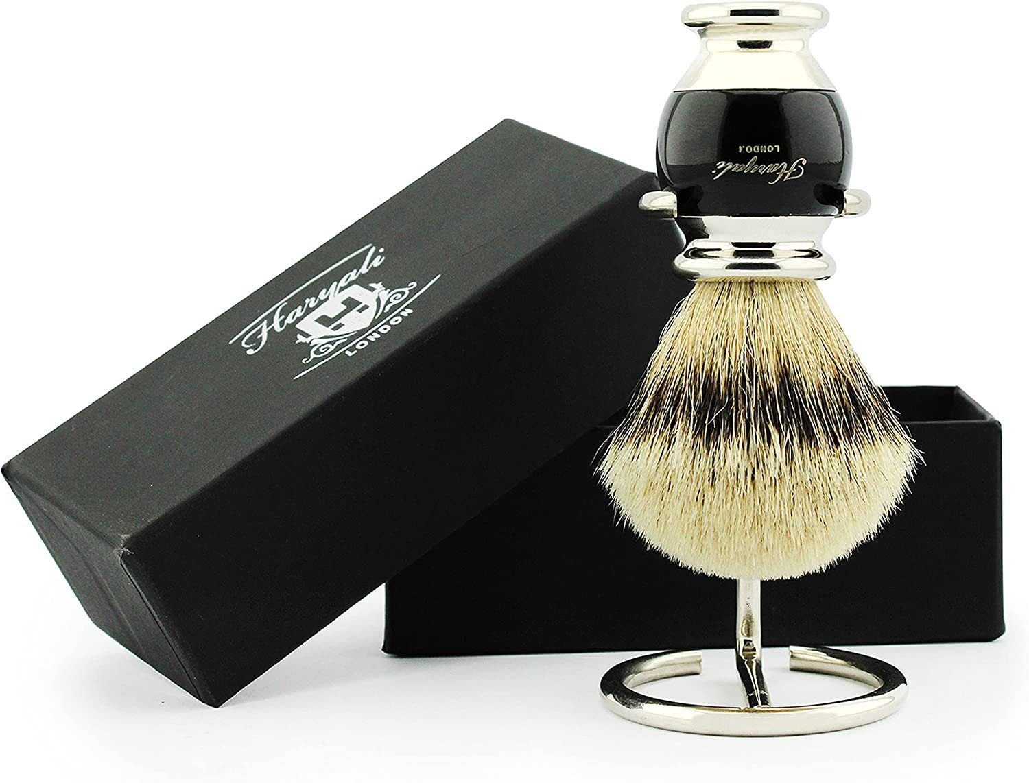 Haryali London Rasierpinsel-Set – Rasierpinsel mit besten Borstenhaaren – Pinselhalter – Perfekter Rasierpinsel für Damenrasierer und Herren-Nassrasierpinsel – Schwarzer Rasierpinsel mit Metallgriff