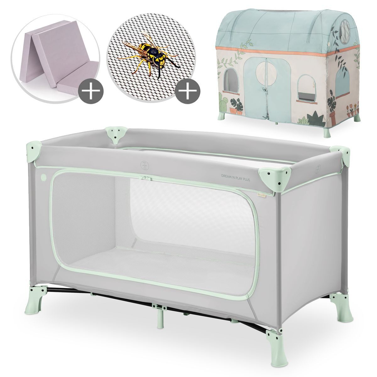 Das Reisebett Dream N Play Plus von Hauck ist ideal für Reisen, Besuche oder als Zweitbett. Es bietet Kindern bis 3 Jahre (max. 15 kg) einen gemütlichen Schlafplatz. Das Set enthält eine komfortable Alvi Reisebettmatratze, ein Spielzelt für kreativen Spaß und ein Insektennetz für ruhige Nächte.