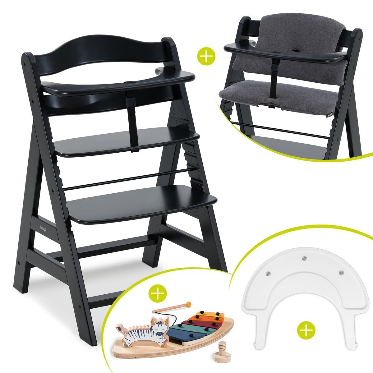 Lieferumfang | Hauck Alpha Plus Hochstuhl - Black 5-Punkt-Gurt Schrittgurt Hauck Hochstuhlauflage Deluxe - Select Line - Jersey Charcoal Hauck Play Tray Basis für Alpha & Beta Hochstuhl Hauck Play Tray Spiel - Xylophon Music-Spielzeug Zebra Holzschraube |
