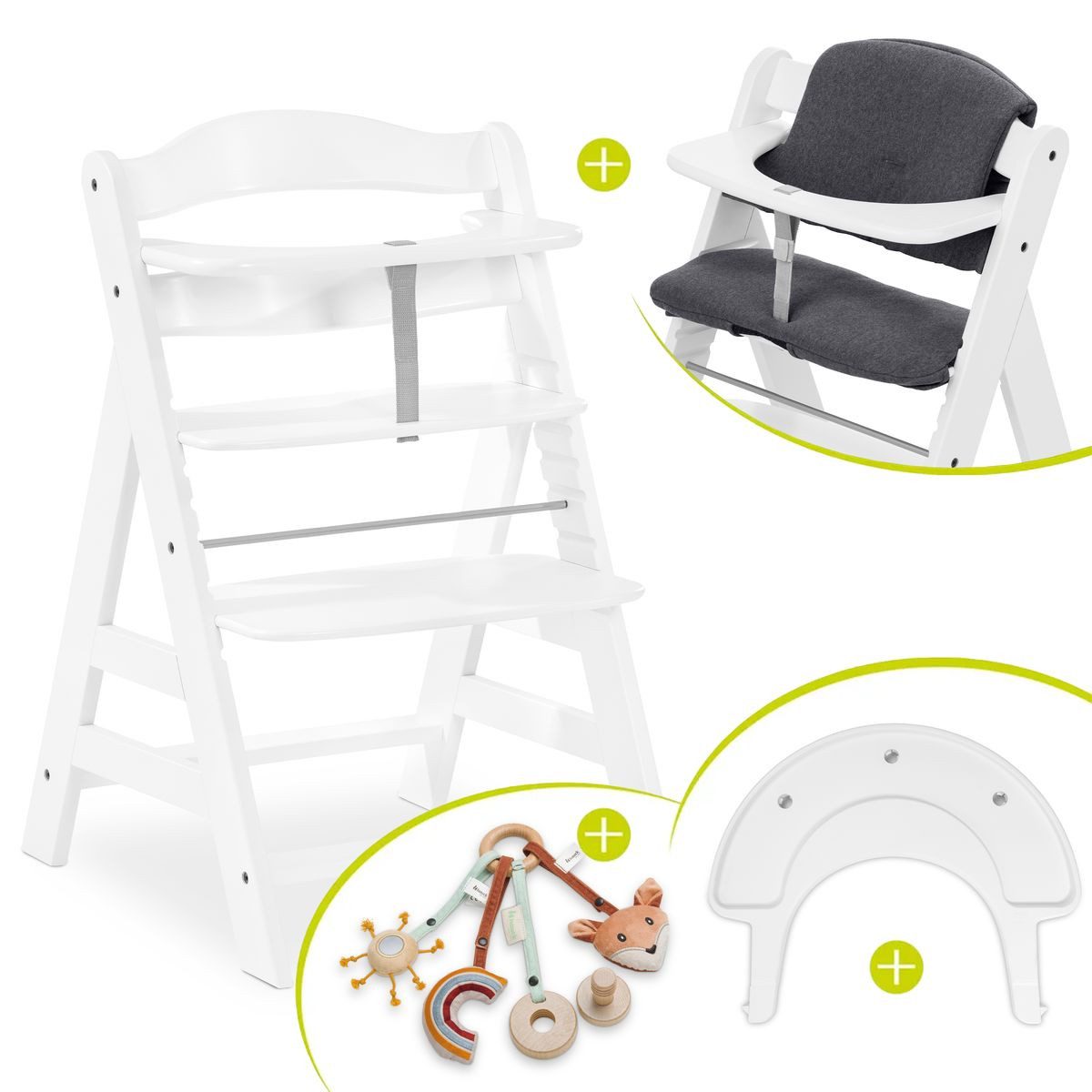 Zusätzlich zu dem reich ausgestatteten Alpha Hochstuhl bekommst Du in diesem Set 3 beliebte Zubehörartikel dazu. Damit Du den Stuhl auch abseits vom Familientisch nutzen kannst, ist das neue Alpha Spielbrett Play Tray und ein passendes Fühl- und Greifspiel Play Catching dabei. Das Play Tray kannst mit einem Klick am Hochstuhl befestigen und die verschiedenen Aufsätze sicher darauf befestigen. Damit Dein Schatz immer weich sitzt bekommst Du zusätzlich eine weiche, 2-teilige Baumwoll-Sitzauflage dazu. Diese polstert die Sitzfläche sowie die Rückenlehne und ist bei 40 Grad waschbar. Damit bist Du perfekt ausgerüstet.Mitwachsender Hochstuhl