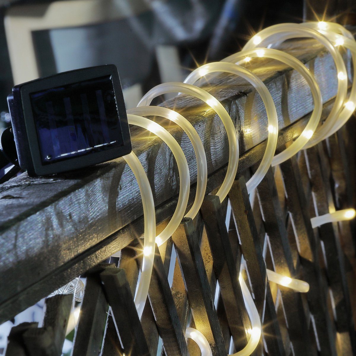 Dieser Lichtschlauch wird per Solarpanel betrieben und benötigt somit keinen externen Stromanschluss. Durch den eingebauten Lichtsensor schaltet sich der Lichtschlauch immer erst zur Dämmerung ein. Vorher hat das Solarpanel also genügend Zeit ausreichend Strom im Akku zu speichern.