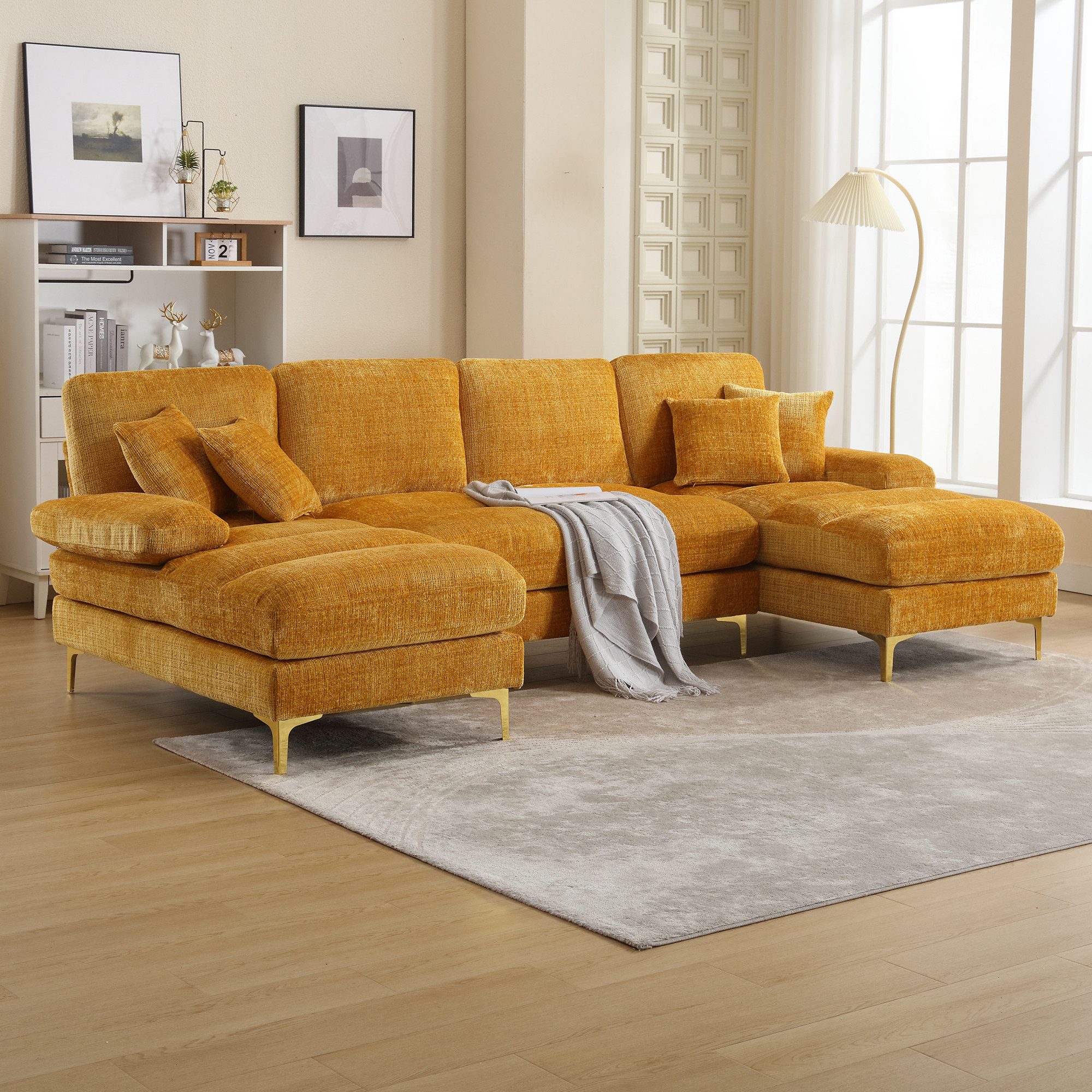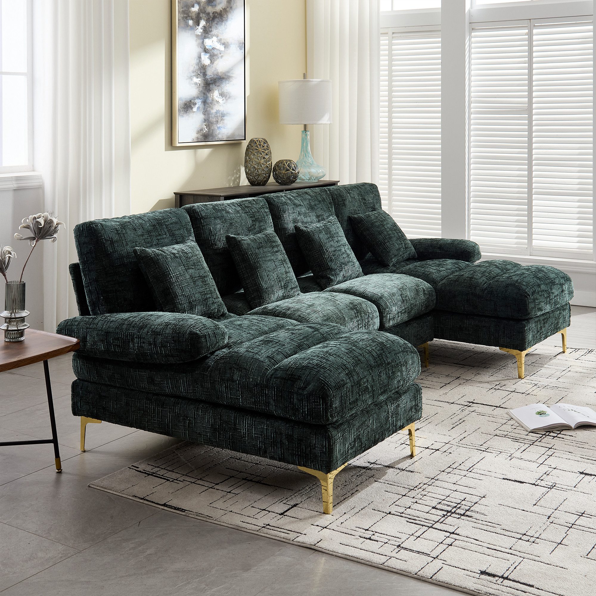 Stabiles Gestell aus Massivholz, Chenille-Stoff, gefüllt mit hochdichtem Schaumstoff, machen dieses modulare Sofa schön und bequem, es passt perfekt zu Ihrer Wohnung, Ihrem Haus oder Ihrem Konferenzraum. Unser modulares Sofa besteht aus einem Massivholz-Gestell mit in den Stoff eingearbeiteten, langlebigen Memory Foam-Kissen, massive schwarze Beine stützen das gesamte Sofa perfekt und können lange verwendet werden