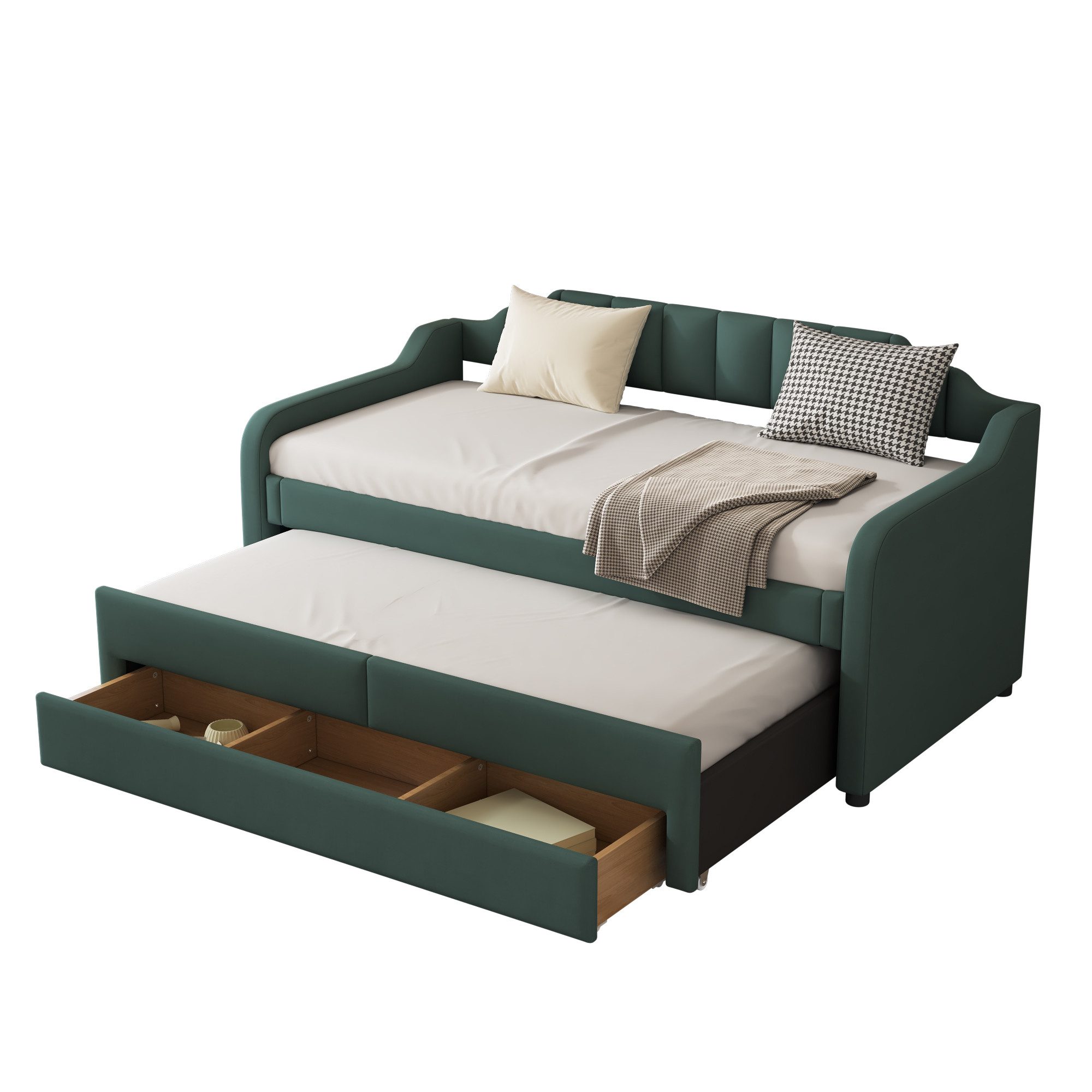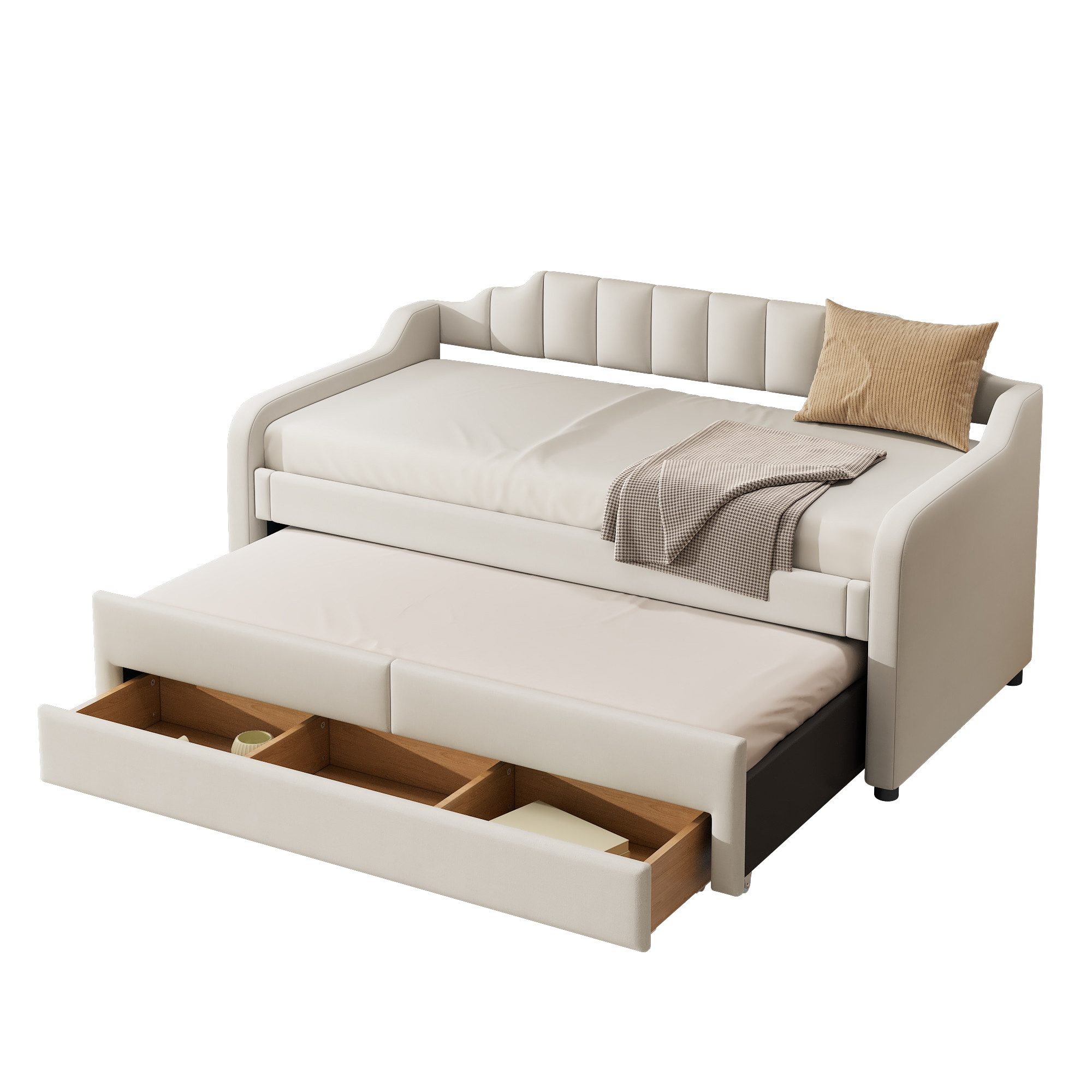 Das multifunktionale Design des Bettes ermöglicht es, es bei Bedarf einfach aus- und wieder einzuziehen. Es bietet nicht nur einen komfortablen Sitzplatz, sondern auch eine zusätzliche Schlafgelegenheit für Übernachtungsgäste. Die sechs integrierten Rollen erleichtern das Bewegen und Anpassen des Bettes.