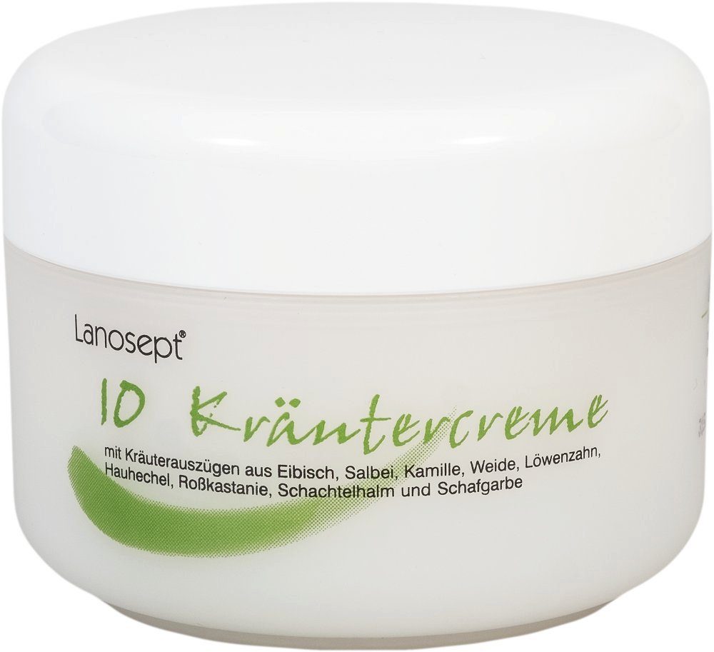 Lanosept 10 KRÄUTER CREME 250 ml nicht nur Frauensache Die 10 Kräuter Creme nützt die hautpositive Wirkung von 10 verschiedenen Kräutern: Eibisch, Salbei, Kamille, Weide, Löwenzahn, Hauhechel, Rosskastanie, Schachtelhalm, Schafgarbe und Ringelblume. Sie kann als Hand-, Gesichts- und Körpercreme angewendet werden, wirkt eher mattierend, sodass sie besonders bei fetter bis normaler Haut zu empfehlen ist. TIPP: Diese Creme eignet sich hervorragend als Pflegecreme für Männer nach der Rasur Enthaltene natürliche Wirkstoffe: Pflanzenextrakt aus Eibisch, Salbei, Kamille, Weide, Löwenzahn, Hauhechel, Rosskastanie, Schachtelhalm und Schafgarbe. Jojoba-, Avocado- und Passionsblumenöl - hochwertige Pflanzenöle als Creme-Basis Sorbit - ein Fruchtzucker der Eberesche mit großem, natürlichen Feuchthaltevermögen Vitamin E - ein die Haut sehr positiv beeinflussendes Vitamin Bienenwachs - ein Stoffwechselprodukt der Bienen als natürlicher Konsistenzgeber
