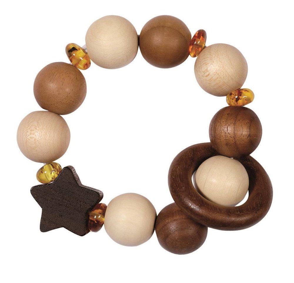 HEIMESS Greifling Elastik Stern mit Bernstein ist ein Greifling aus Ahorn- und Nussbaumholz. Zwischen den Holzperlen befinden sich Perlen aus Bernstein. Er hat einen Durchmesser von etwa 10 cm. Ein Holzring lässt sich über die Holzelemente schieben.