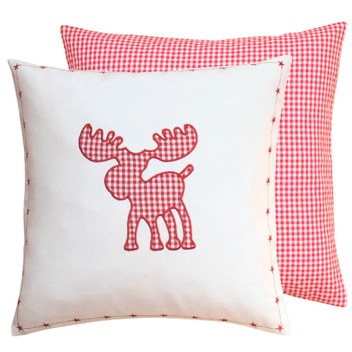 1 Deko - Kissenhülle aus Vichy Karo rot-weiß I liebevoll bestickt mit süßer Elch Applikation und kleinen Sternen