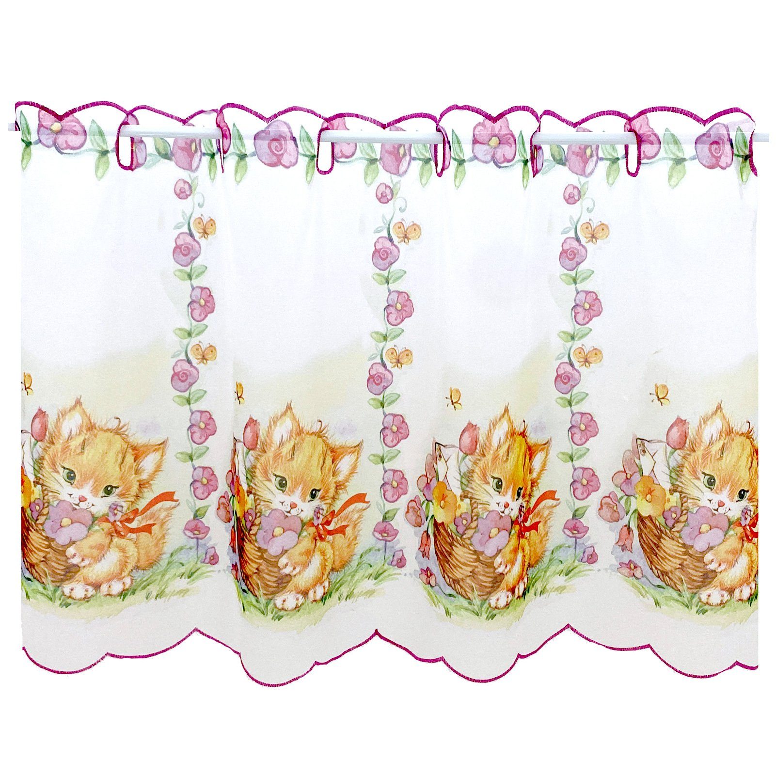 1 super süße Scheibengardine für Kleinfenster oder Flügelfenster I aus weichfliesendem Voile bedruckt mit kleinen Baby Katzen im Körbchen und schöner Blumenranke I edel gebogte Kante mit Sticksaum in pink rosa I Stangendurchzugslöcher – geeignet für Gardinenstangen bis 16 mm Durchmesser I Höhe ca. 45 cm I Breite ca. 85 cm I Diese wunderschöne Gardine eignet sich zur Dekoration von kleinen Fenstern im Kinderzimmer oder für Flügelfenster bzw. geteilten Fenstern. Für größere Fenster sieht es sehr schön aus zwei der Bistrogardinen anzubringen. So kann auf und zu geschoben werden und mittig ist Platz für eine schöne Fensterdeko oder eine Pflanze.