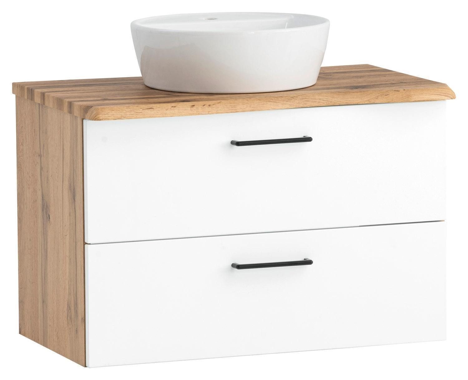 Lieferumfang | 1 Waschbeckenunterschrank mit 1 Keramikaufsatzbecken und 2 Schubladen. Permanentablauf oder Garnituren sind nicht enthalten |