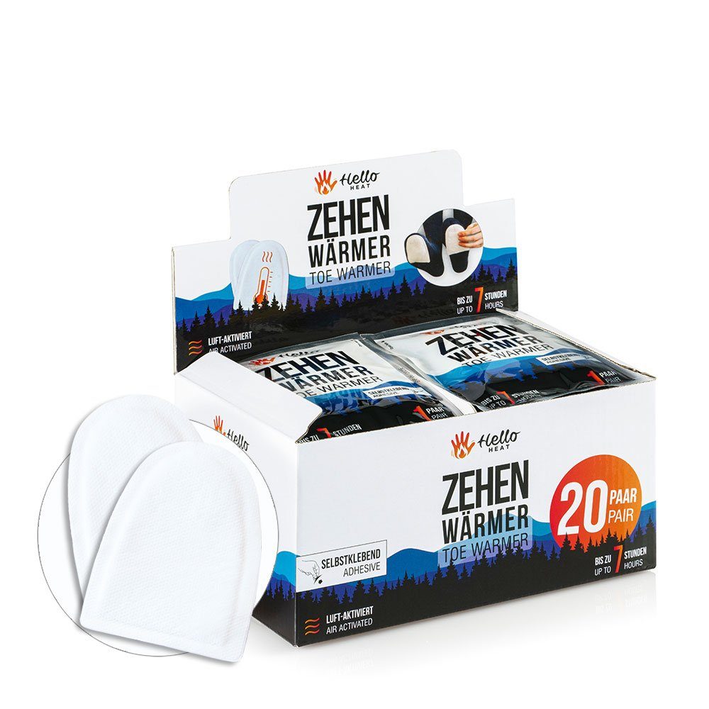 20 Paar luft-aktivierte Zehenwärmer von Hello Heat. Qualität zu günstigen Preisen! Warme Füße für bis zu 7 Stunden. Zehenwärmer von Hello Heat werden einfach aus der Verpackung genommen. Nach dem Entfernen der Schutzfolie werden die Wärmer mit der Klebeseite an den Socken angebracht (oben oder unten). Es dauert einige Minuten, bis die Wärmer ihre volle Heizleistung entfalten. Sie haben angenehme und warme Füße bis zu 7 Stunden. Ideal für alle isolierten Winterschuhe für Winteraktivitäten aller Art. So macht Winter Spaß!