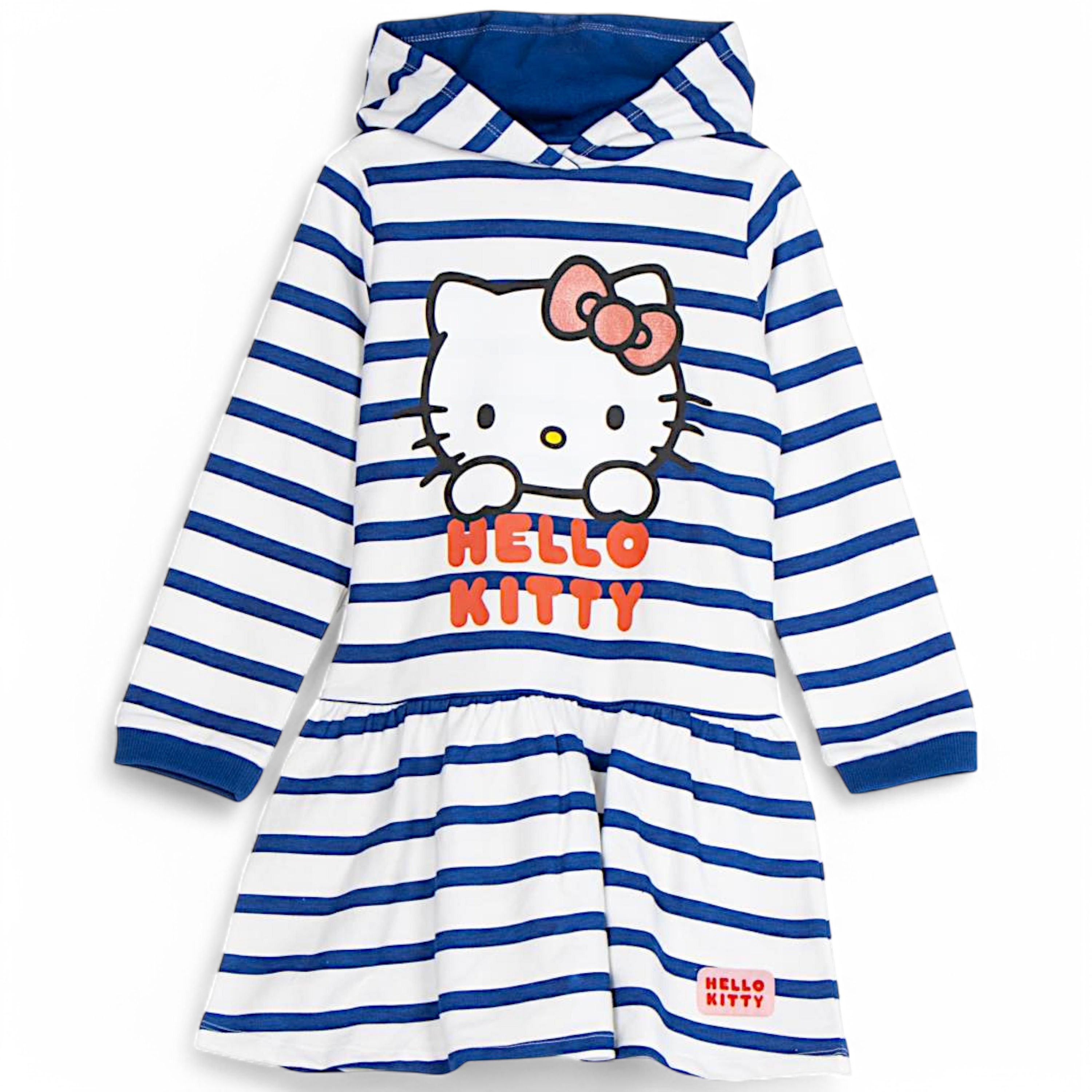 Das langärmelige Kleid mit maritimen Streifen in Blau-Weiß kombiniert niedliches Design mit gemütlichem Tragekomfort. Die große Hello-Kitty-Applikation auf der Vorderseite sorgt für einen verspielten Look, während der ausgestellte Rockteil eine süße, mädchenhafte Note verleiht.