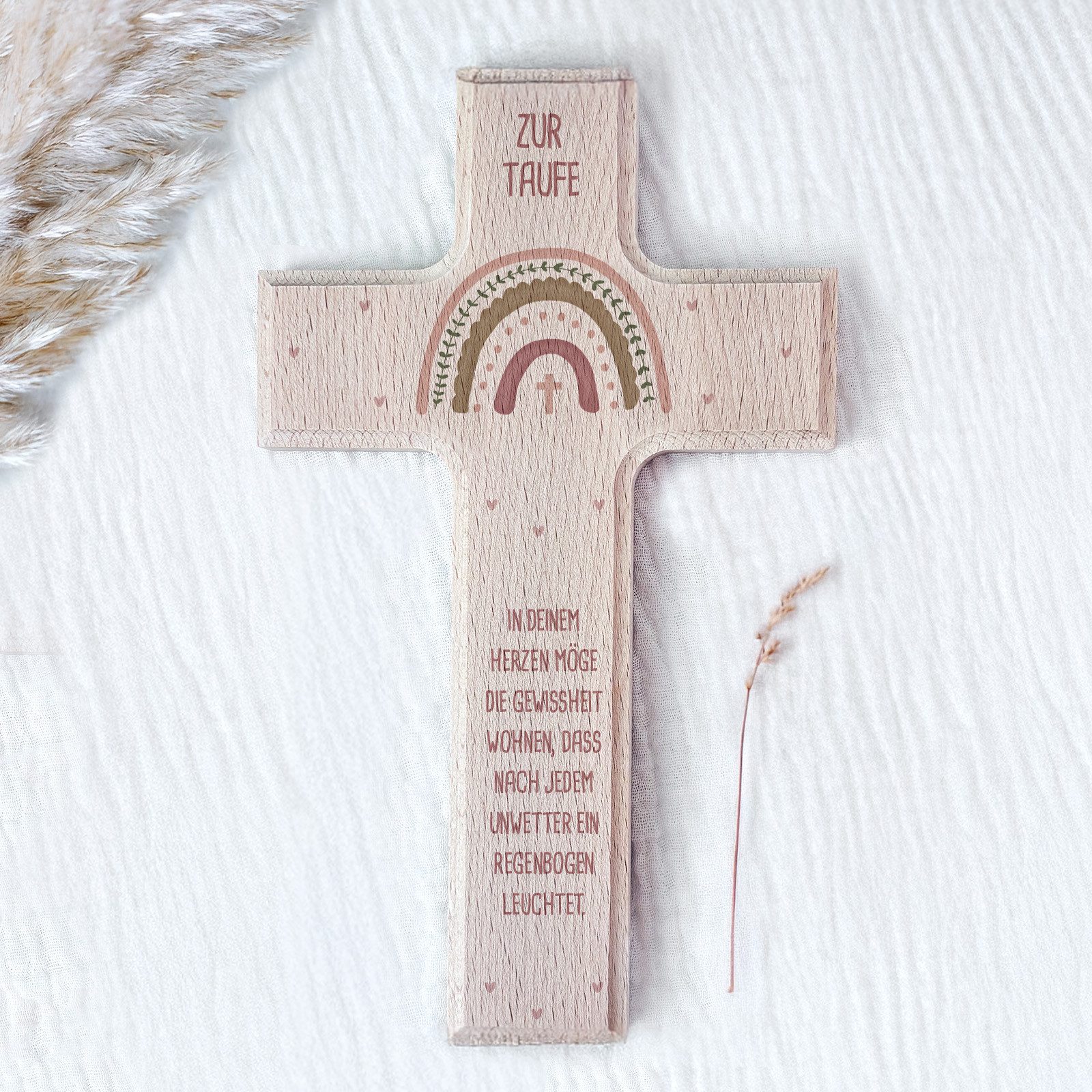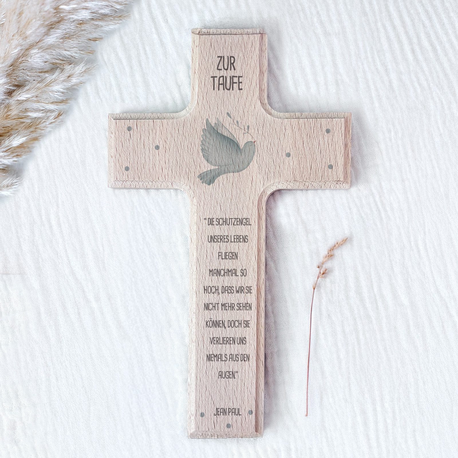Neben dem Motiv befindet sich noch ein Taufspruch oder einer Botschaft auf dem Kreuz. Ob klassisch oder biblisch – das Motiv verleiht dem Kreuz eine noch tiefere Bedeutung.