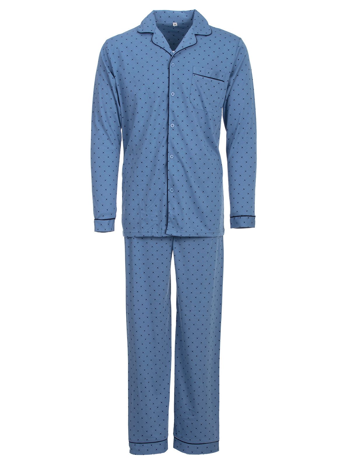 Eleganzer zeitloser Schlafanzug. Der Herrenschlafanzug ist angenehm auf der Haut zu tragen. Brusttasche auf dem Oberteil. Oberteil durchgeknöpft. Die lange Schlafanzughose hat einen Dehnbund.