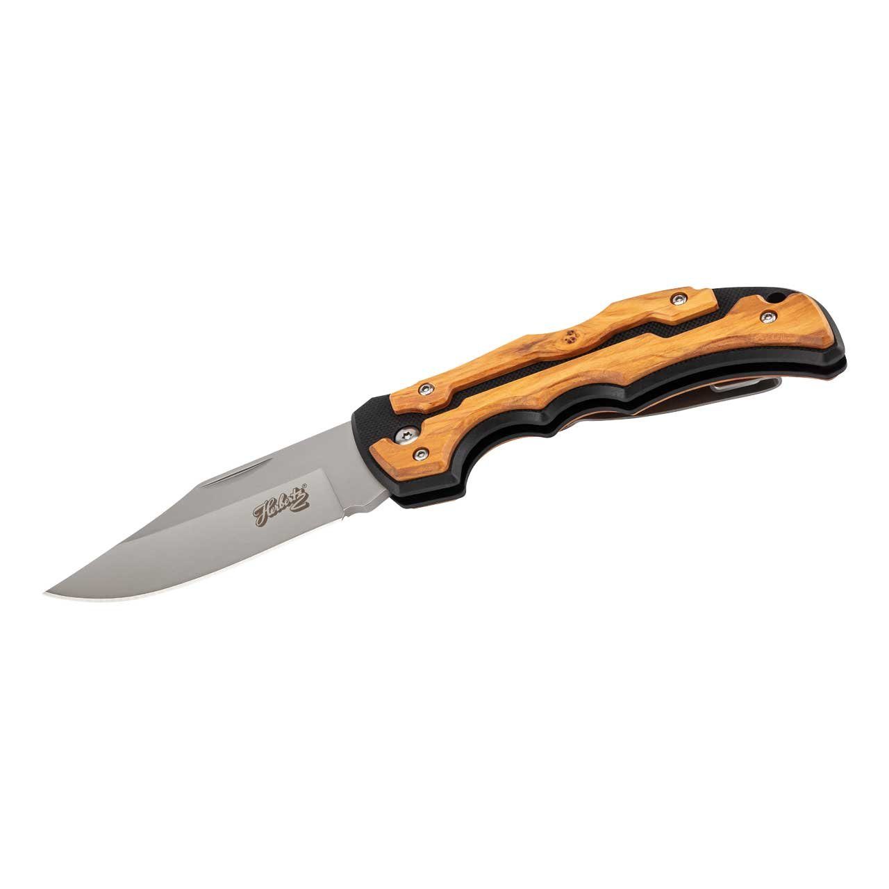 Modernes Messerdesign und großartige Materialien werden bei diesem Taschenmesser aus der Herbertz Selektion Linie stilvoll kombiniert. Die sandgestrahlte Clip Point Klinge aus rostfreiem AISI 440 Stahl wird von einem Back Lock Mechanismus zuverlässig arretiert Die Griffmaterialen aus schwarzem G10 und Auflagen aus Olivenholz bilden einen schönen Kontrast. Dank des ergonomischen Designs und den ausgeprägten Fingermulden liegt das Heft sicher in der Hand. Ein Tip Up Taschenclip sowie eine Fangriemenöse runden die Ausstattung ab. Eine attraktive Geschenkverpackung ist im Lieferumfang bereits enthalten.