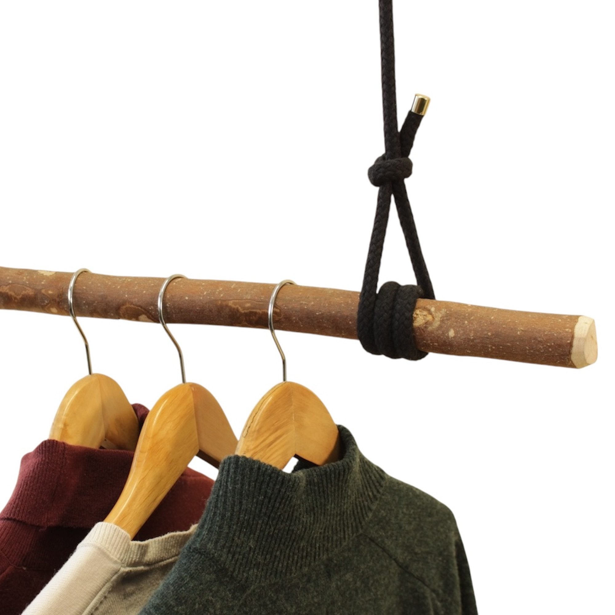 Lieferumfang | 1x Holzstange: Naturstock mit Rinde mit abgerundeten Enden, 2x Seil: Baumwollseil (Weiß/Schwarz). Die Enden der Seile sind mit einer Endkappe (Gold/Silber) aus Messing abgeschlossen. Die Seile werden zum aufhängen bereit geliefert., 2x Schraubhaken mit Sicherheitsschnalle aus legiertem Stahl (Gold/Silber) und 2x Dübel 6mm. |