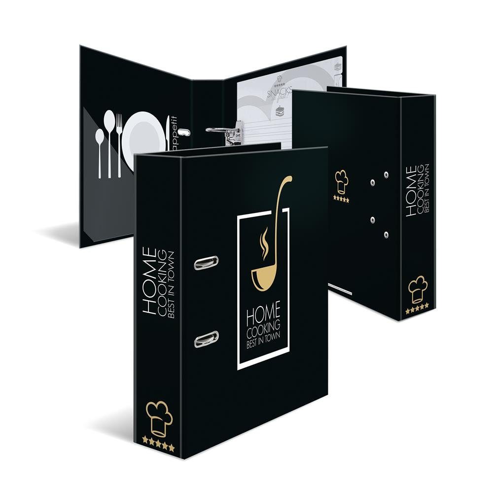 Viel Platz für allerfeinste Koch- und Backrezepte bietet der HERMA Motiv-Ordner "Homecooking" im Format DIN A4, passend für alle Klarsichthüllen mit Standardlochung. So bleiben Rezepte gut geschützt vor Spritzern und Fingerabdrücken. Mit dem praktischen 6-teiligen Register lassen sich Rezepte, Ideen, Tipps und Tricks leicht einordnen und wieder finden. Das Register ist unterteilt in "Soups, Snacks & Sauces", "Pasta & Co.", "Meat", "Veggies & Seafood", "Dessert" sowie einer freien Seite zum selbst beschriften. Ideal für alle, die gerne kochen, in der Küche Neues ausprobieren oder einfach mal herumexperimentieren möchten. Der dekorative Ordner im schicken schwarzen Design ist aus stabilem Karton gefertigt, hat eine hochwertige Hebelmechanik mit Niederhalter und ist mit Goldfolie veredelt – ein Hingucker im Küchenregal. Besonders clever: die aufgeklebte Einstecktasche auf der Innenseite für wichtige Notizen und mehr.