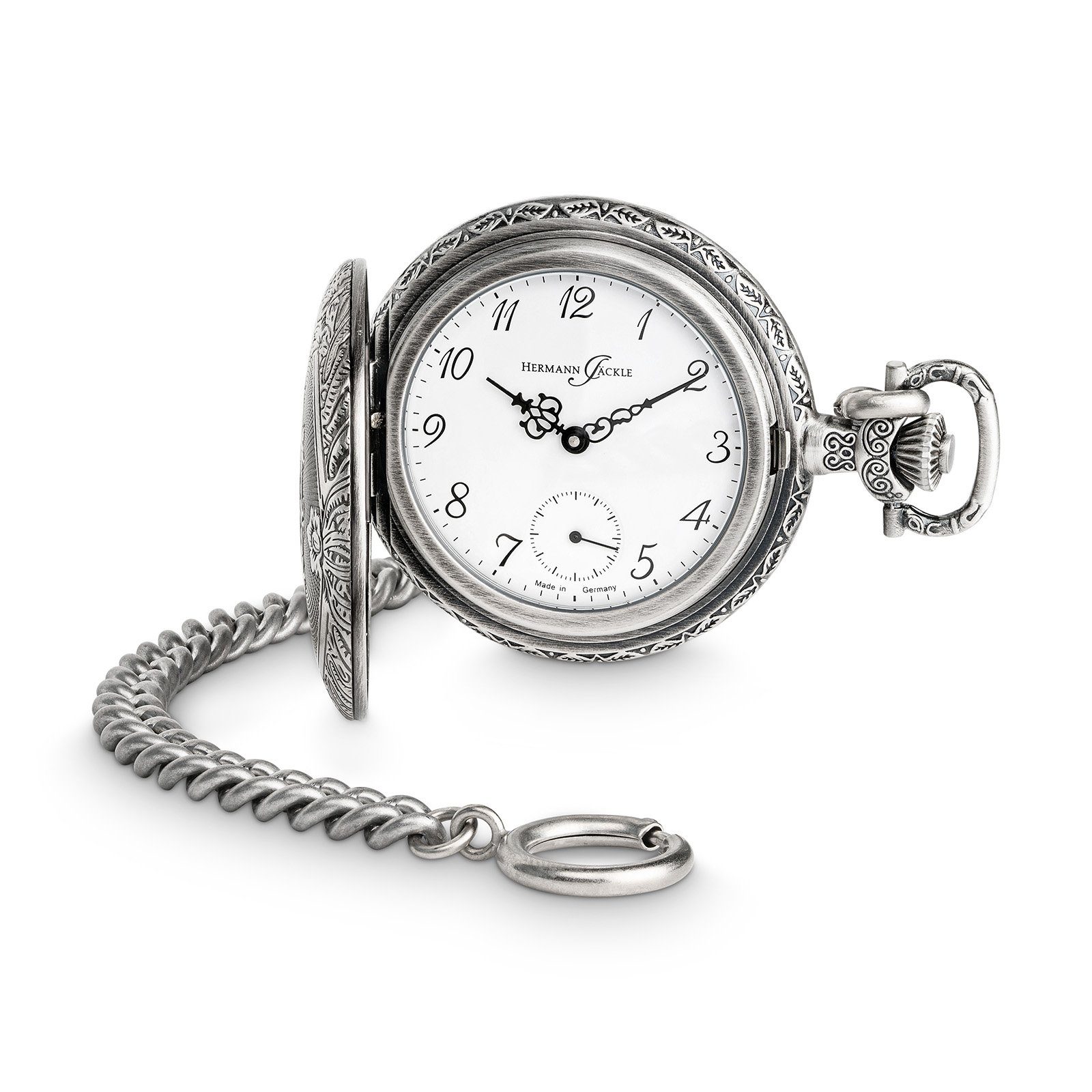 Erleben Sie nostalgischen Charme mit der Hermann Jäckle Schöntal 2 Antiklook Taschenuhr. Handaufzug, Mineralglas, imposante 50 mm, antikes Design. Komplett mit stilvoller extra starker Kette und Reiseetui - ein zeitloses Accessoire für Liebhaber klassischer Eleganz.