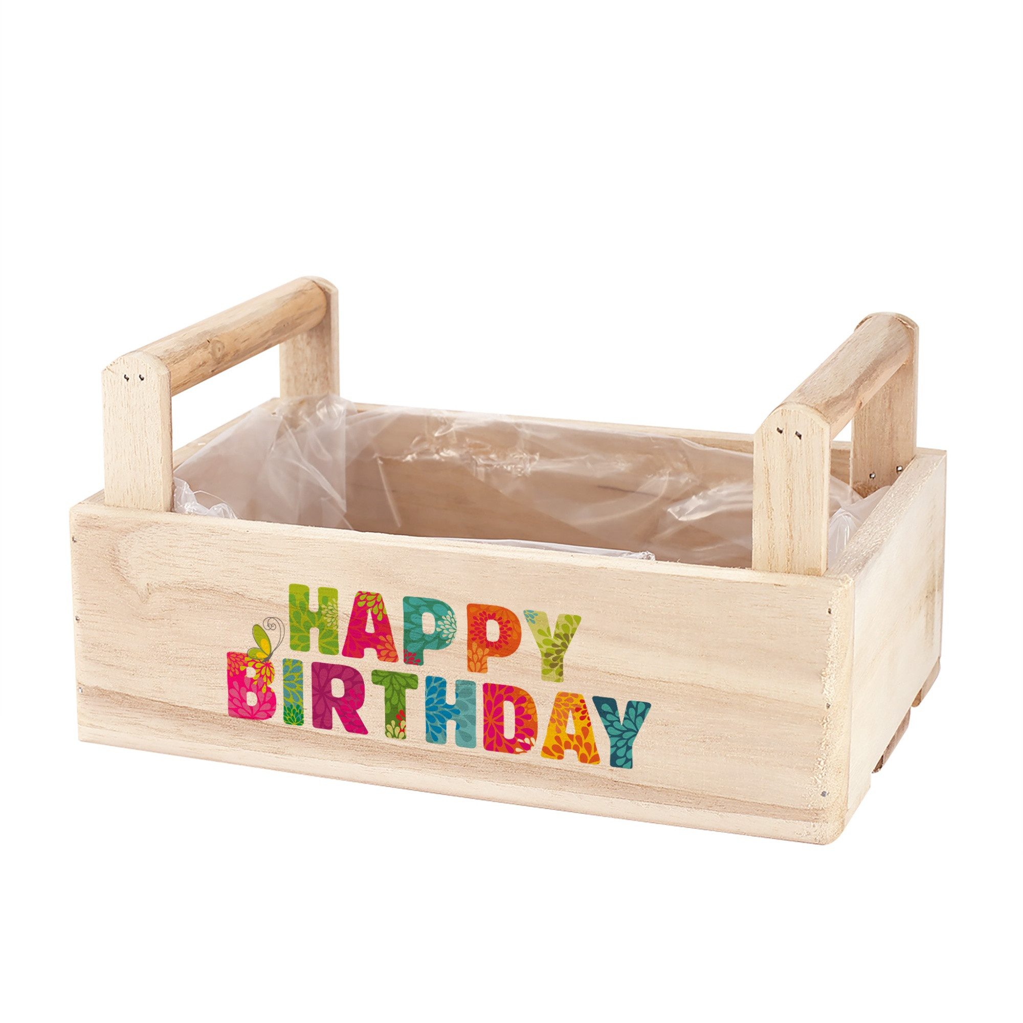 Die robuste Holzkiste ist aus hochwertigem Naturholz gefertigt und mit einem fröhlichen "Happy Birthday"-Schriftzug in bunten Buchstaben verziert. Sie bietet ausreichend Platz für kleine Geschenke, Blumen oder andere Dekorationsideen und kann auch als stilvolle Aufbewahrungslösung dienen. Die seitlichen Griffe sorgen für eine einfache Handhabung, während die transparente Kunststofffolie im Inneren die Kiste wasserfest macht – perfekt, um sie mit Blumen oder Pflanzen zu bestücken.