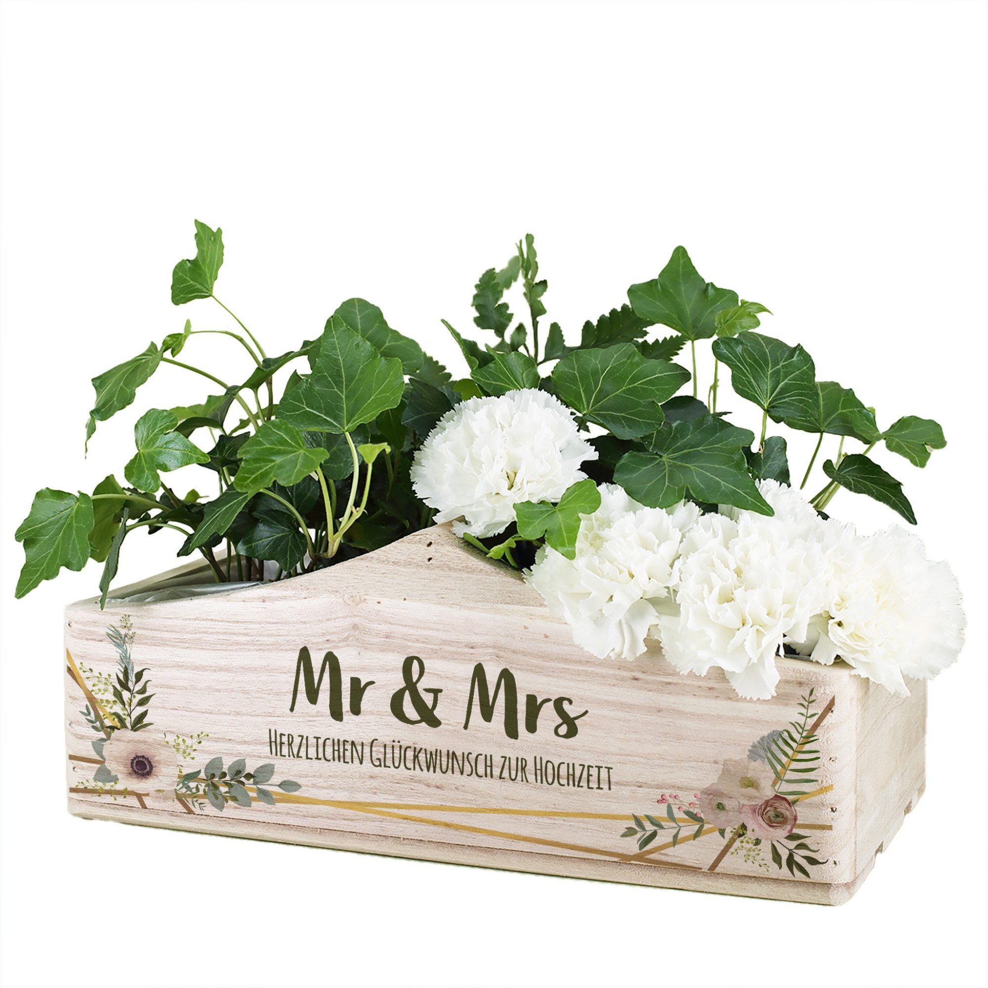 Dieses dekorative Geschenk für Hochzeiten ist sowohl stilvoll als auch praktisch. Die Pflanzkiste trägt die Aufschrift "Mr & Mrs - Herzlichen Glückwunsch zur Hochzeit" und bietet Platz für verschiedene Ihrer Dekorationsideen. Passend während z.B. grüne Pflanzen mit weißen Blumen, die die Reinheit und den Neuanfang symbolisieren, dazu etwas Efeu das für Beständigkeit und Freundschaft steht, was besonders gut zu Hochzeiten passt.