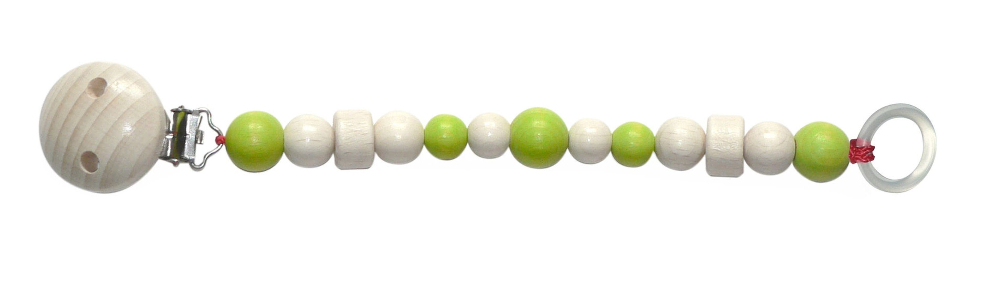 Babyspielzeug Schnullerkette soft apfelgrün Die Schnullerkette besteht aus verschiedenen Holzteilen, Kugeln, Ring und Perlen. Auf der einen Seite besitzt die Kette einen Metallclip mit der die Kette ganz leicht und sicher befestigt werden kann. Am anderen Ende hat sie einen festen Silikonring an der der Schnuller fest gemacht wird. Der Anhänger ist aus Buchenholz gefertigt und teilweise bunt lackiert mit Farben die auf Wasserbasis und lösungsmittelfrei basieren BxLxH 35x20x210mm NEU |