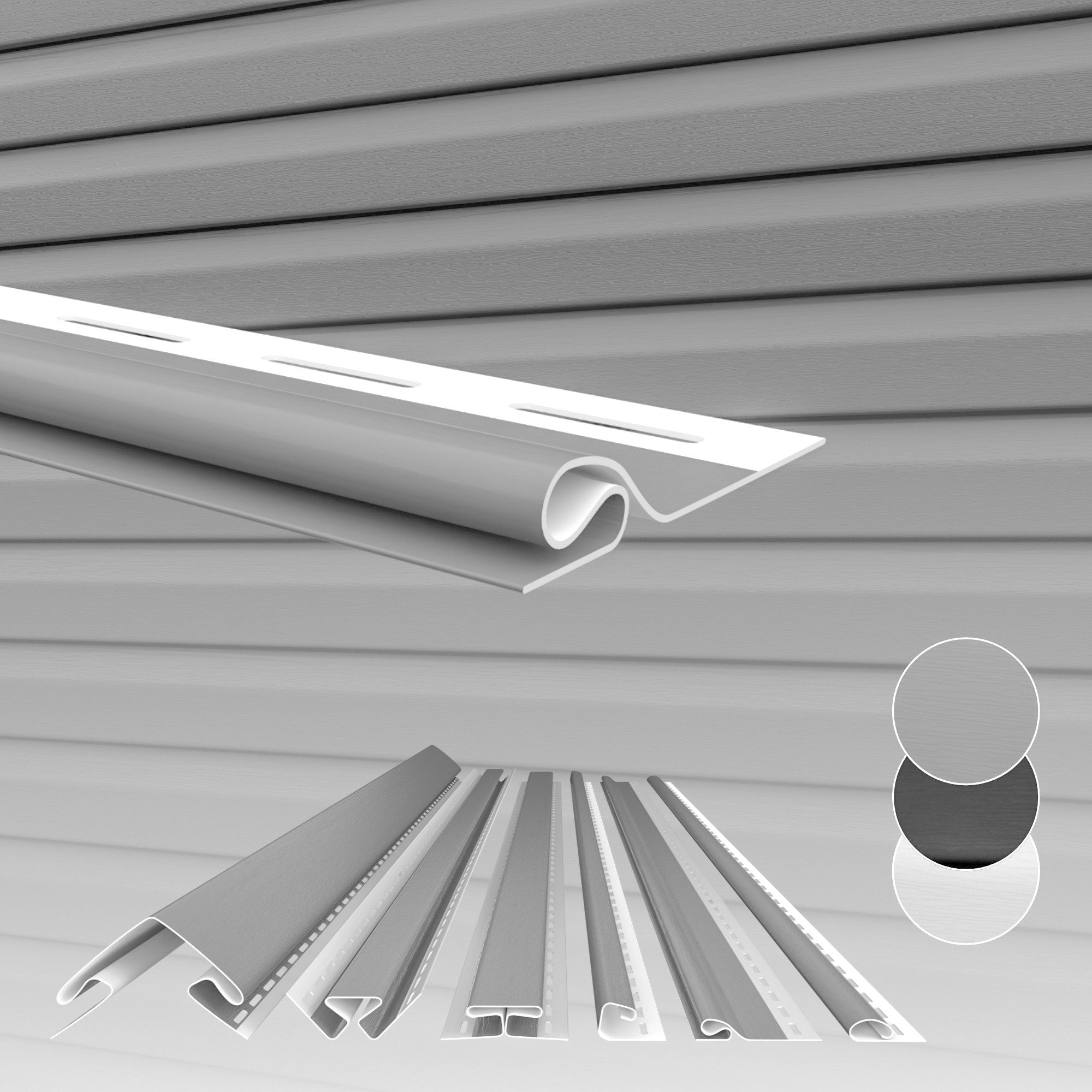 Das Abschlussprofil dient als oberer Abschluss der Verkleidung und wird in das J-Profil eingesteckt. Das Außeneck- und Inneneckprofil dient als Verbindungselement zwischen den Paneelen und ermöglicht einen sauberen Übergang der Außenfassade. Das Anfangsprofil wird als unterstes Fassadenprofil verwendet und sorgt für eine verdeckte Montage sowie den Abfluss von Wasser am Fuß der Verkleidung. Das J-Profil wird als oberer Abschluss der Fassadenverkleidung installiert, um ein stimmiges Gesamtbild der Fassadenverkleidung zu sichern. Verbindungsprofile werden verwendet, um waagerecht verlegte Paneele stoßweise miteinander zu verbinden und eine harmonische Fläche zu schaffen. Sie sind besonders langlebig und bieten über viele Jahre hinweg einen gleichbleibend guten Schutz für das Gebäude. Bei der Montage werden die Schrauben mittig der Löcher gebohrt, jedoch muss hierbei unbedingt Platz für die Dehnung gelassen werden. Optimal sollte die Fassade 10-15cm über den Boden beginnen. Bitte achten Sie während der Montage sorgfältig darauf, dass die Vinyl Sidings keine Spalten oder Öffnungen aufweisen, die Regenwasser eindringen lassen könnten.