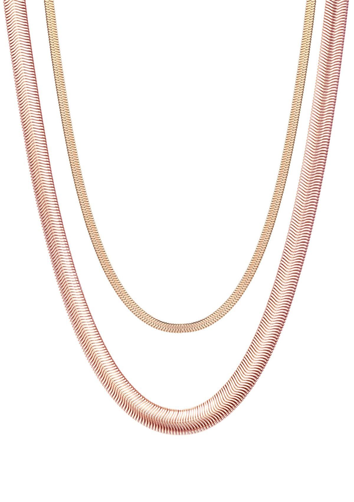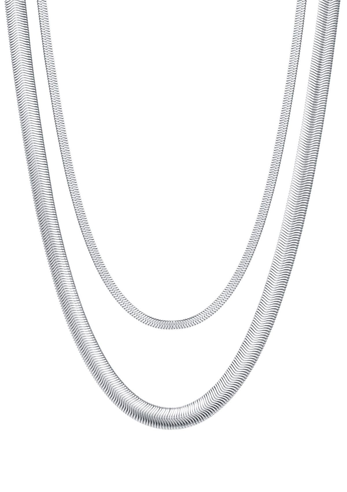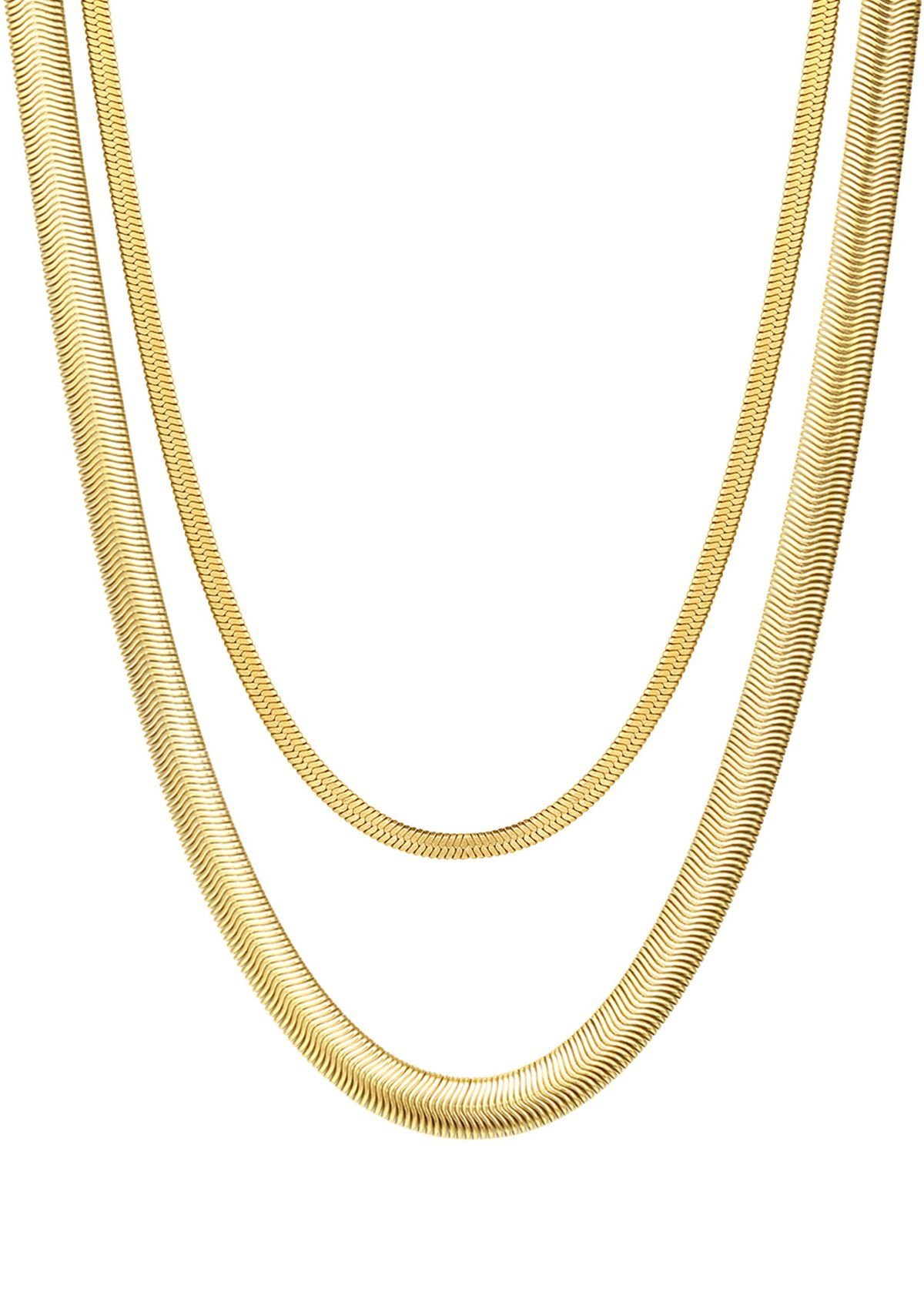 Das Halsketten-Set umfasst eine Schlangenkette mit einer leichten Spitze in der Mitte, die, wenn sie verbunden wird, ein Chevron-Muster ähnlich einer Schlangenhaut erzeugt, und eine Fischgrätenkette mit einzigartigen, spitzen Gliedern, die in einem stilvollen Muster ineinander greifen. Dieses Halsketten-Set besteht aus plattiertem Edelstahl, der in Gold, Silber und Roségold erhältlich ist. Es hat eine gute Balance zwischen Fließfähigkeit und Steifigkeit, sodass sie beim Tragen an Ort und Stelle bleiben. Das schlichte und dennoch elegante Design dieses Kettensets macht es perfekt für jeden Anlass. Die Größenangaben: