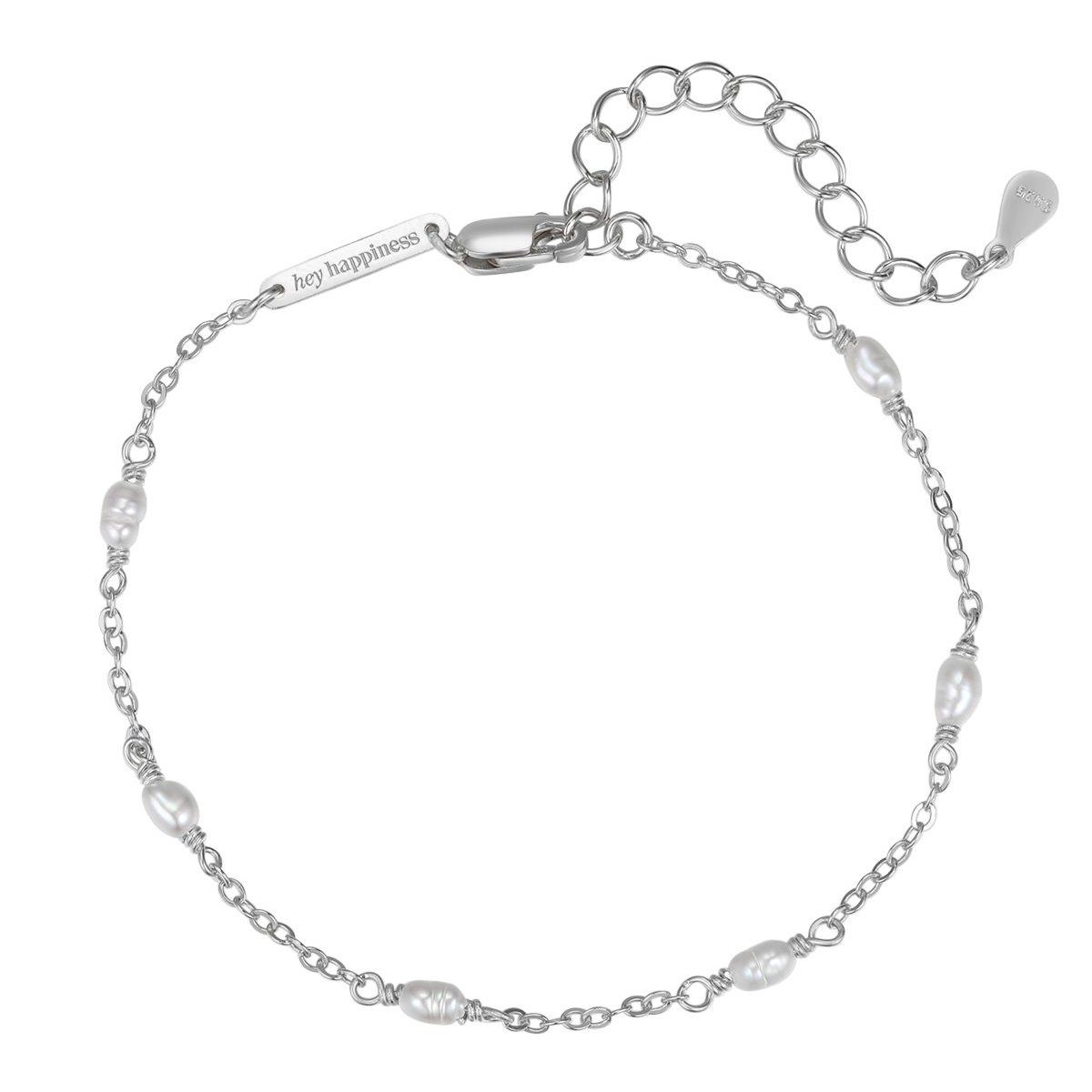 Zarte Sterlingsilber Armkette, geschmückt mit 6 kleinen, unregelmäßig geformten Süßwasserperlen. Das ist ein stilvolles Accessoire, das genauso gut zu lässigen als auch zu eleganten Looks passt. Das Armband verfügt über einen stabilen Karabinerverschluss und eine Verlängerungskettchen.