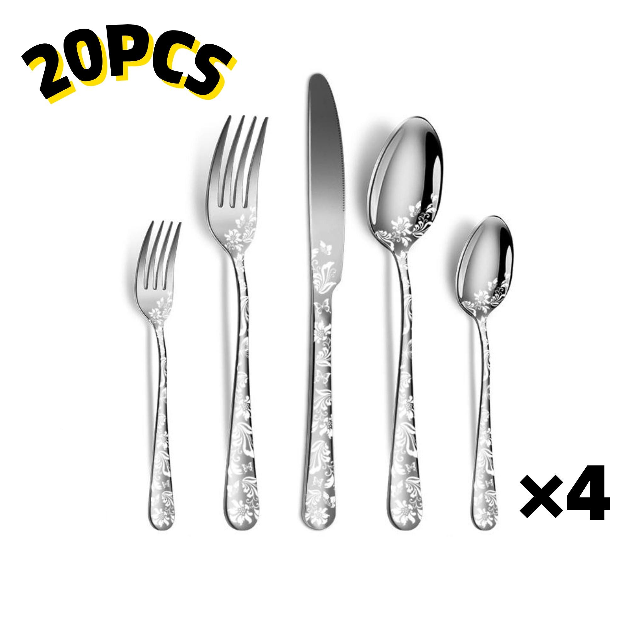 Mit insgesamt 20 Teilen bietet dieses Set eine vollständige Ausstattung für jede Mahlzeit. Die 4 Messer sind perfekt zum Schneiden von Steak oder anderen Fleischgerichten geeignet, während die 4 Gabeln das einfache Aufnehmen von Speisen ermöglichen. Die 4 Löffel eignen sich ideal für Suppen oder Beilagen, während die 4 Teelöffel und Dessertgabeln perfekt für den Genuss von Kaffee und Desserts sind.