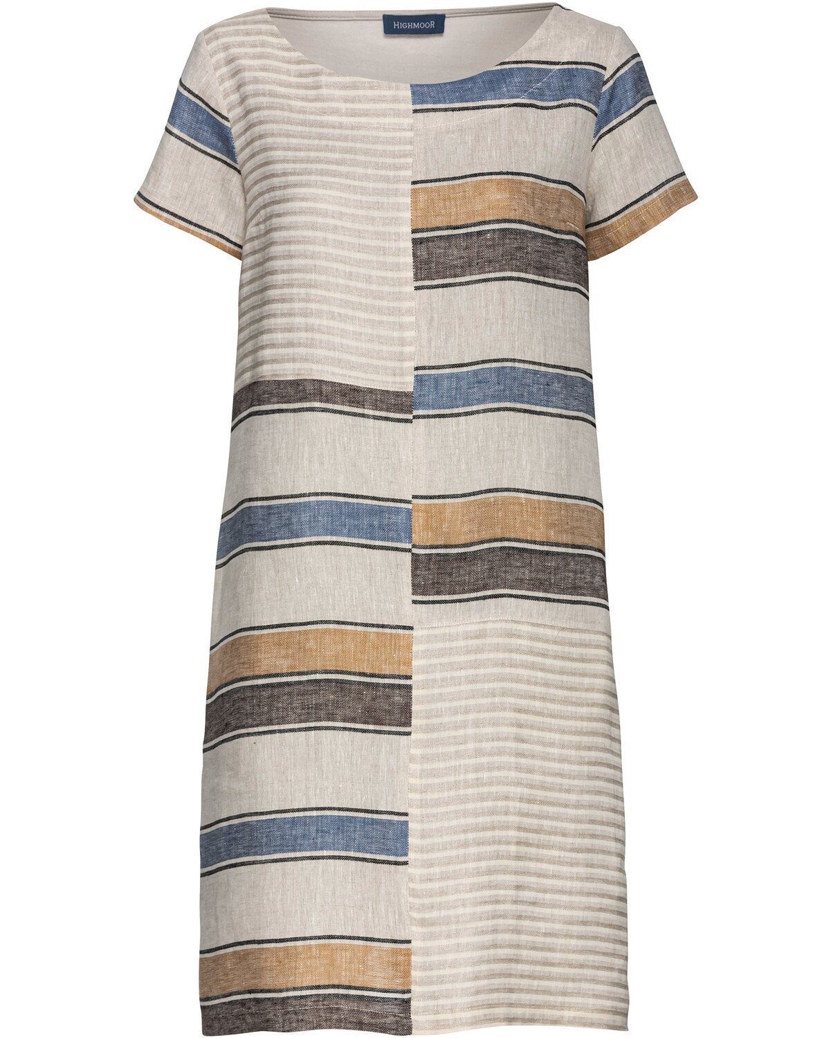 Das raffiniert designte Streifenkleid von HIGHMOOR zeigt sich sowohl in kontrastfarbigen unterbrochenen Blockstreifen als auch tonigen feinen Streifen. Das Modell mit Rundhalsausschnitt und kurzen Ärmeln ist vorne und am hinteren Rock aus luftigem Leinen gefertigt, während der Rücken aus Polyester mit Stretchanteil besteht. Die Midilänge und die Passform in Comfort-Fit runden das sommerliche Kleidungsstück ab. Oberstoff: 100% Leinen; Sonstige Materialien: Rücken, 95% Polyester, 5% Elastan