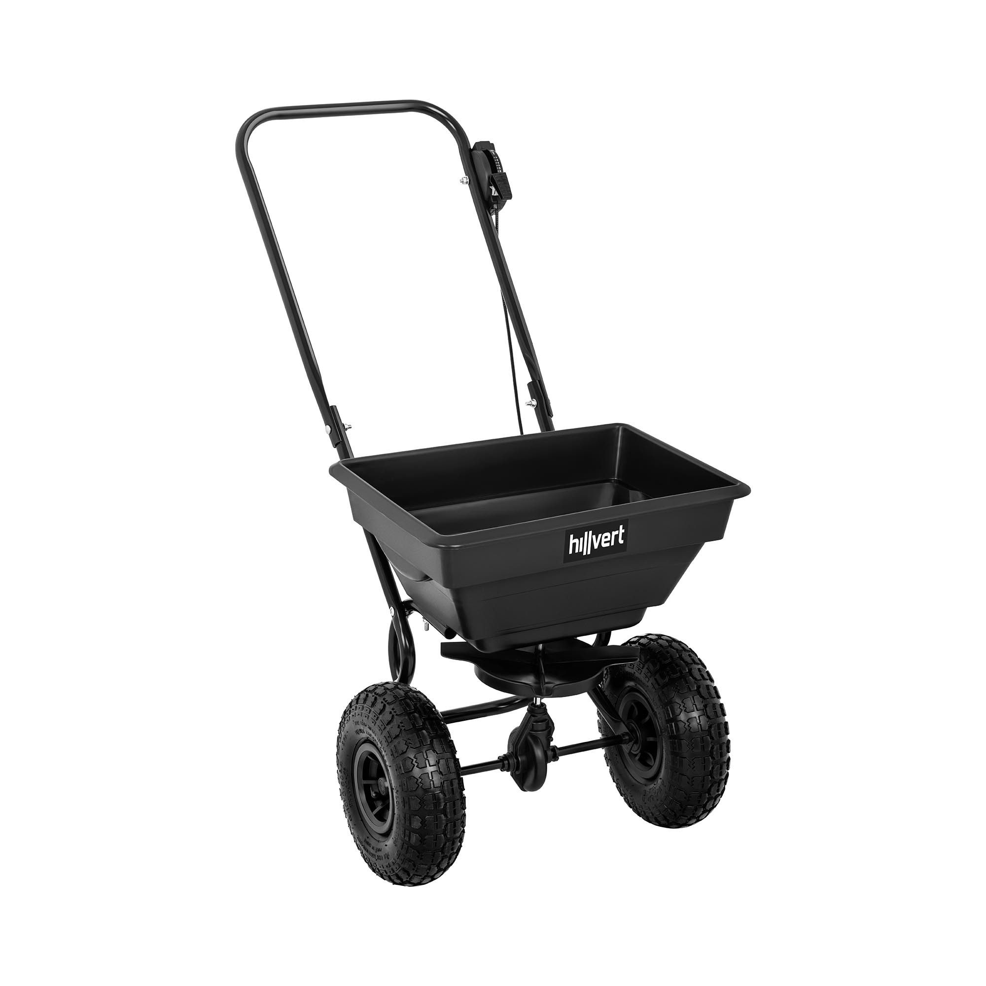 hillvert steht für bedienungsfreundlichen Handwerksbedarf, der das Gärtnern einfach macht. Deswegen ist der Streuwagen durch seine durchdachte Konstruktion besonders bequem in der Handhabung. Auf 25,5 cm großen Lufträdern läuft der Düngewagen nicht nur stabil, sondern lässt sich auch mühelos und wendig manövrieren. Das Fassungsvermögen von 14 l ermöglicht eine Bearbeitung mittelgroßer bis großer Flächen in einem einzigen Arbeitsschritt. Durch den Einstellhebel am Griff kann die Abgabe des Streuguts ohne Bücken präzise eingestellt oder über einen Verschlussmechanismus ganz verhindert werden. Diese Funktion sorgt dafür, dass während eines Stillstands keine ungewollte Abgabe von Streugut zu befürchten ist.