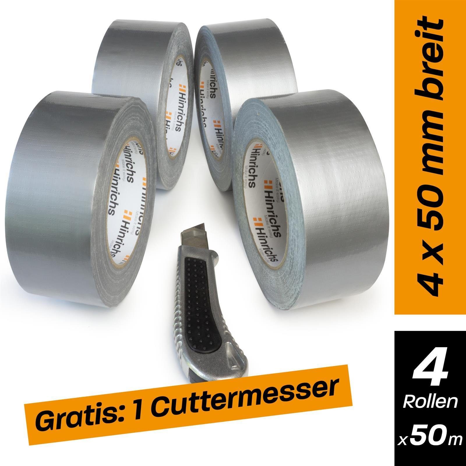 Hinrichs 4 Rollen Klebeband silber Panzerband - Panzertape für Innen und außen - 50 m x 50 mm Plus Cuttermesser