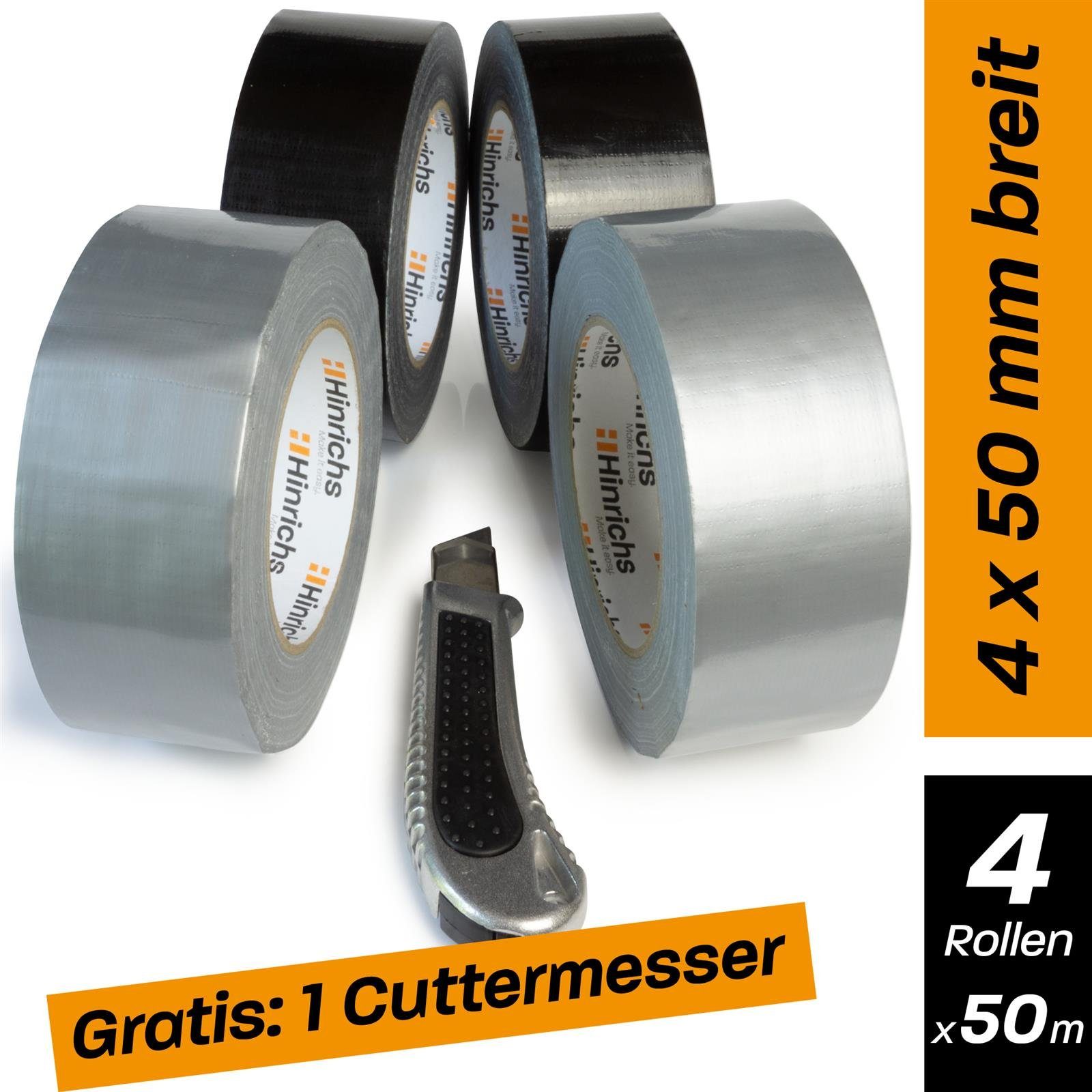 4 Rollen Power Klebeband Maß: Je Rolle 50 m x 50 mm Farbe: Schwarz und Silber Material: Natur Kautschuk GRATIS: 1 Cuttermesser
