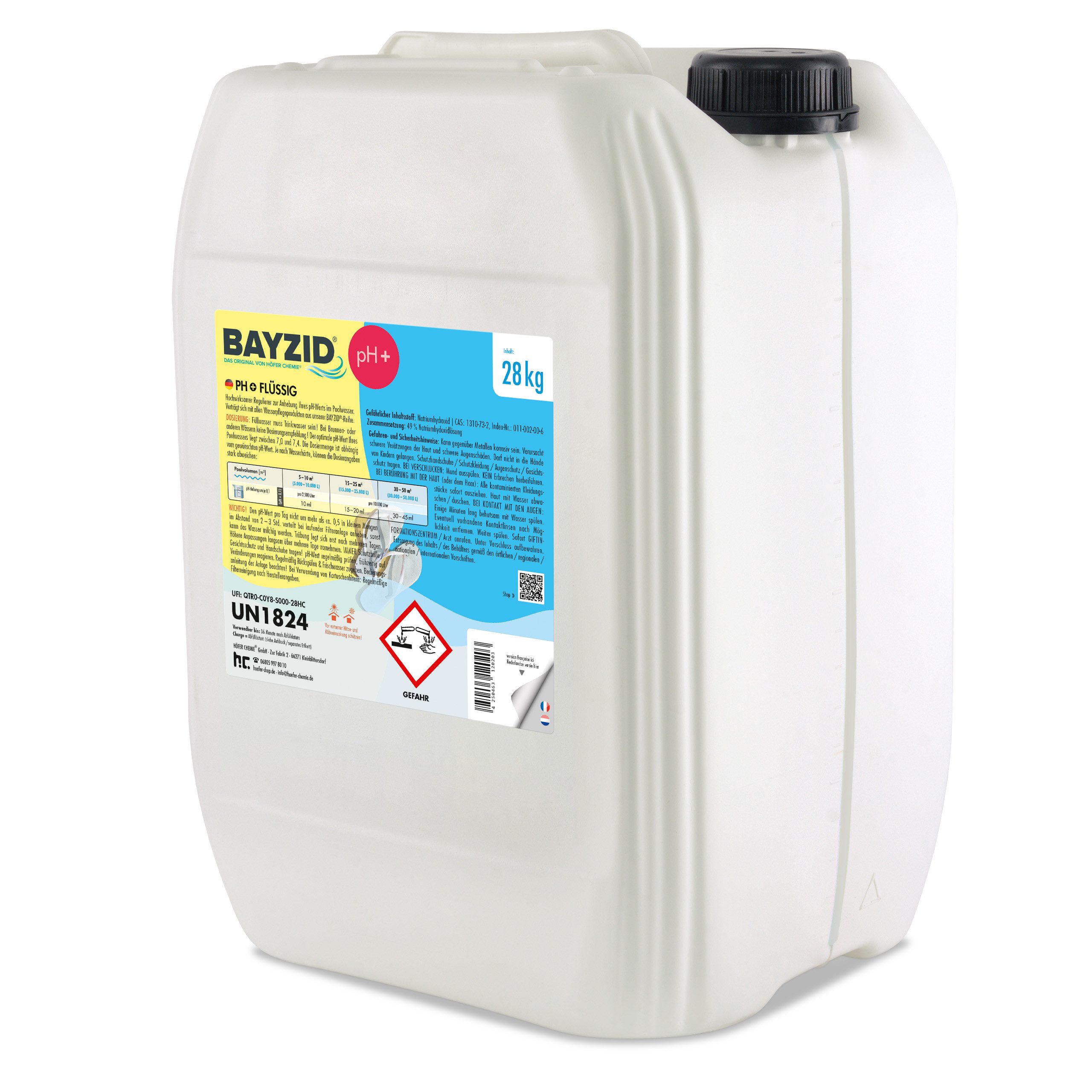 Verträgt sich mit allen Höfer Chemie ® Wasserpflegemitteln. Besonders rein und lagerstabil im 28 kg Kanister. Der Anschluß ist DIN 61 und die Maße des Kanisters (in cm): Höhe 40, Длина 30, Breite 24. Vor extremer Hitze- und Kälteeinwirkung schützen !