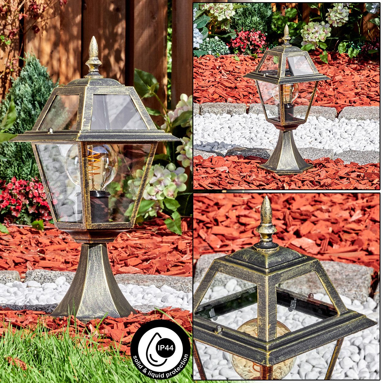 • Das Metallgehäuse in Schwarz und Gold kombiniert mit transparentem Glasschirm schafft stimmungsvolles Ambiente und fügt sich harmonisch in jede Außenanlage ein.