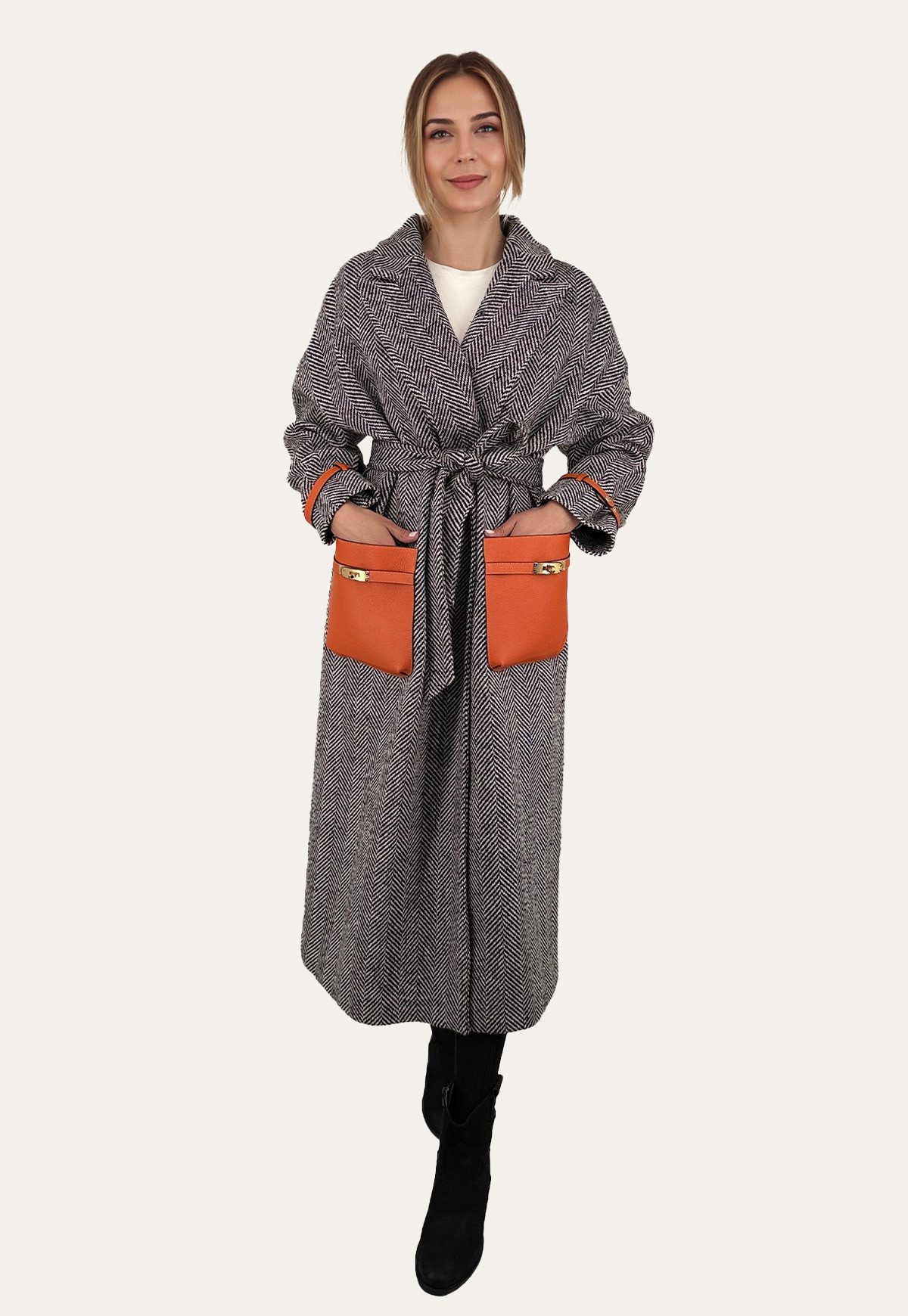 Verleihen Sie Ihrem Outfit mit unserem eleganten Damen Wollmantel im zeitlosen Fischgrätmuster in Schwarz/Weiß das perfekte Finish! Dieser stilvolle Mantel kombiniert klassische Designs mit modernen Akzenten, darunter auffällige orangene Details aus hochwertigem Leder, die dem Look eine frische Note verleihen.