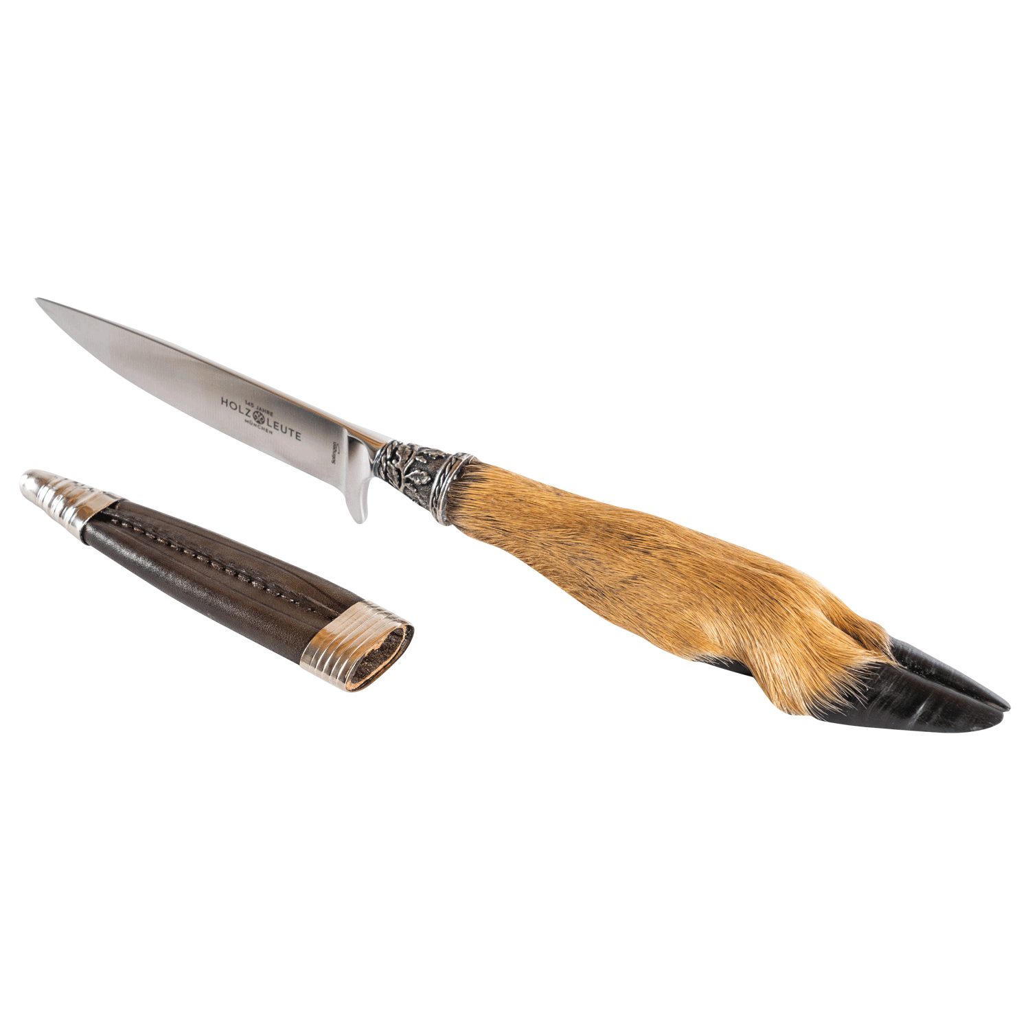 Dieses urig bayrische Lederhosenmesser ist für alle, die nach einer Alternative zu den gängigen Trachtenmessern suchen. Anstatt eines Griffes aus echtem Hirschhorn, besticht dieses Lederhosenmesser durch einen Griff aus einem Rehlauf. Es liegt angenehm samtig in der Hand und ist mit einer hochwertigen matten Klinge aus der Messerstadt Solingen ausgestattet. Die versilberte Verbindung zwischen Klinge und Griff ist mit schönen Details aus Eichenlaub-Ornamenten verziert.