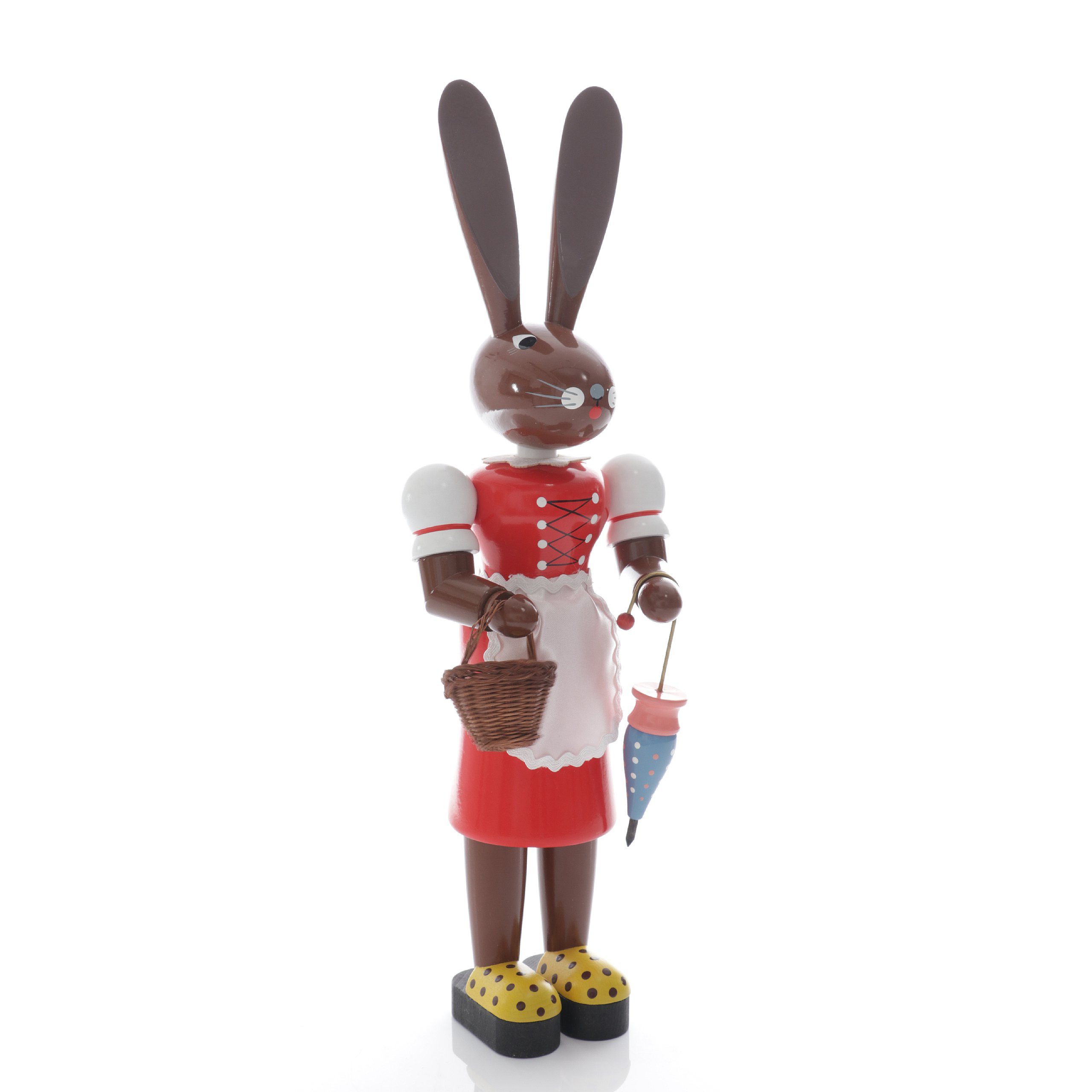 Osterdekoration Osterhäsin mit Blume und Schirm bunt Diese schöne Osterhäsin hat eine Höhe von 42 cm und ist farbig gestaltet. Der Hase steht und hält in den Händen einen Blume und den Schirm. Всеs wird in verschiedenen Arbeitsschritten komplett aus Holz im Erzgebirge gefertigt Höhe 42cm NEU |