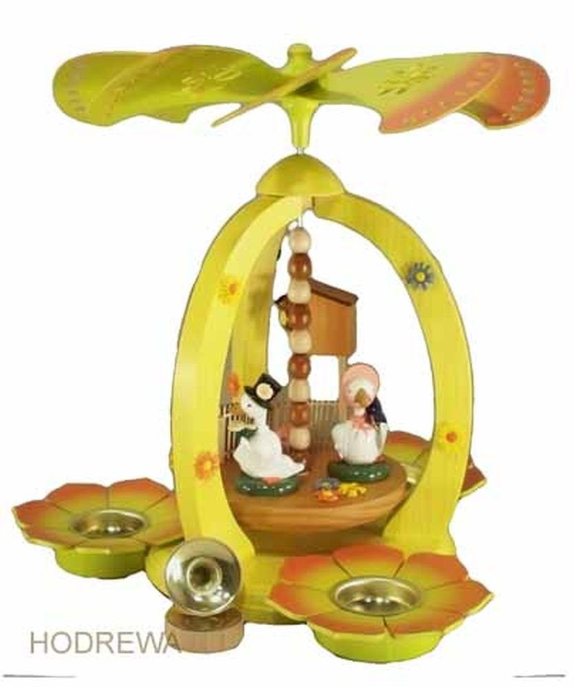 Osterdekoration Pyramide mit Gänsen bunt Mit dieser tollen Pyramide holen Sie sich ein Stück Erzgebirge. Sie hat eine Размер von 28 cm und wird in verschiedenen Arbeitsschritten komplett im Erzgebirge gefertigt. Auf dem Teller drehen sich kleine Gänse. Angetrieben wird die Pyramide mit Teelichtkerzen dafür hat Sie unten 3 Messingeinsätze. Die Figuren und das Gestell der Pyramide sind aus Holz hergestellt und ist farbig gestaltet Höhe 28cm NEU |
