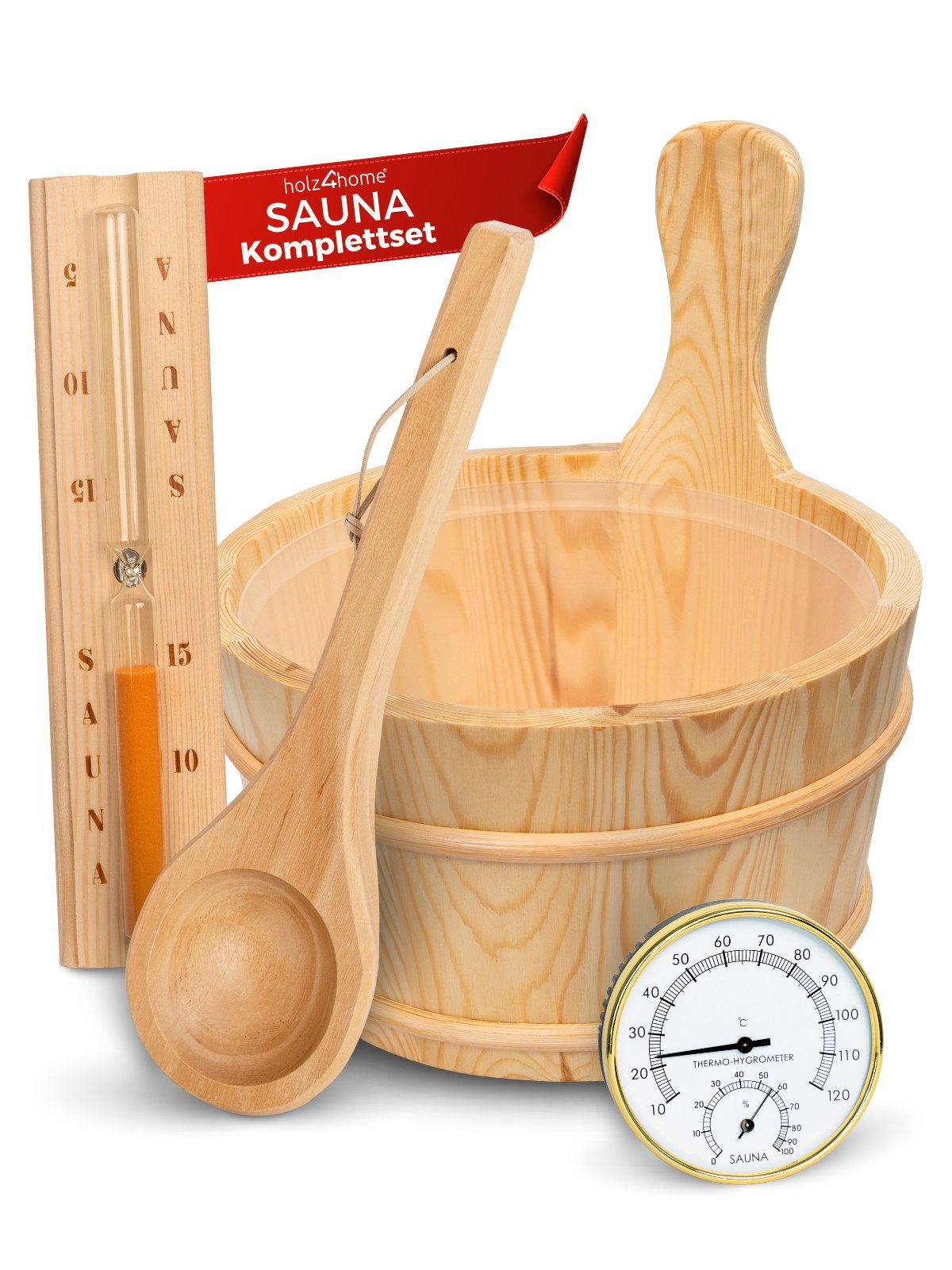 Sauna Zubehör Set aus Holz mit Eimer, Kelle, Sanduhr und Thermo-Hygrometer – für ein stilvolles, sicheres und entspanntes Saunaerlebnis zuhause oder im Garten.