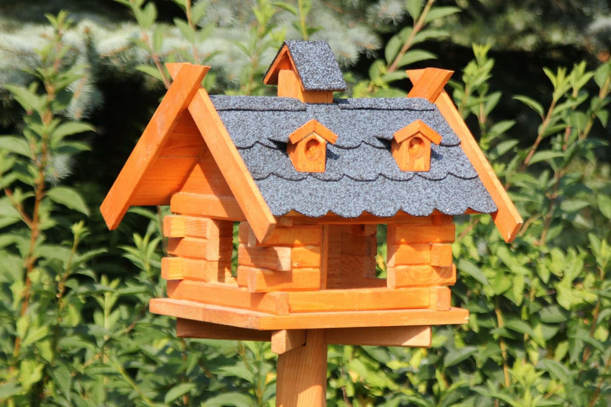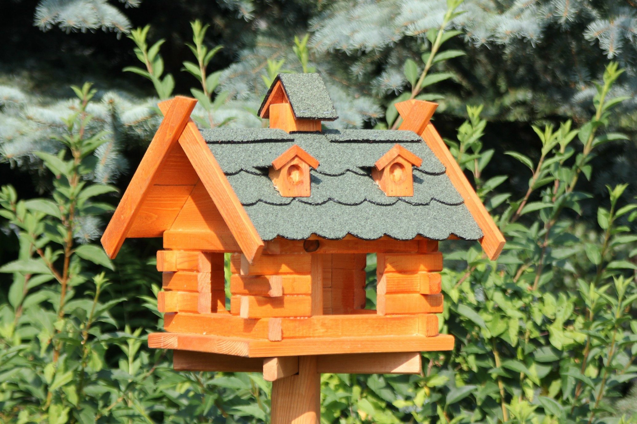 Das Vogelhaus aus Holz mit Bitumenschindeln gedeckt ist imprägniert und wetterfest.
