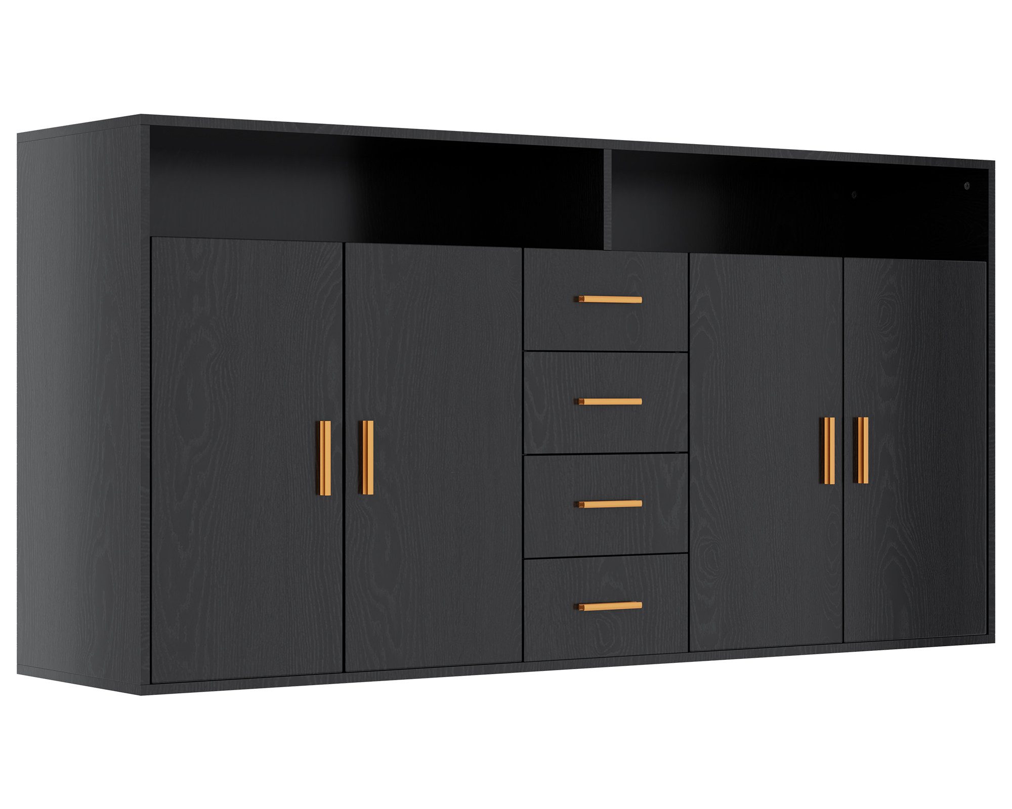 Die Kombination aus 2 Türen mit verstellbaren Einlegeböden, 4 leichtgängigen Schubladen und 2 offenen Fächern schafft Platz für Deko, Geschirr, Bücher oder Büroutensilien.