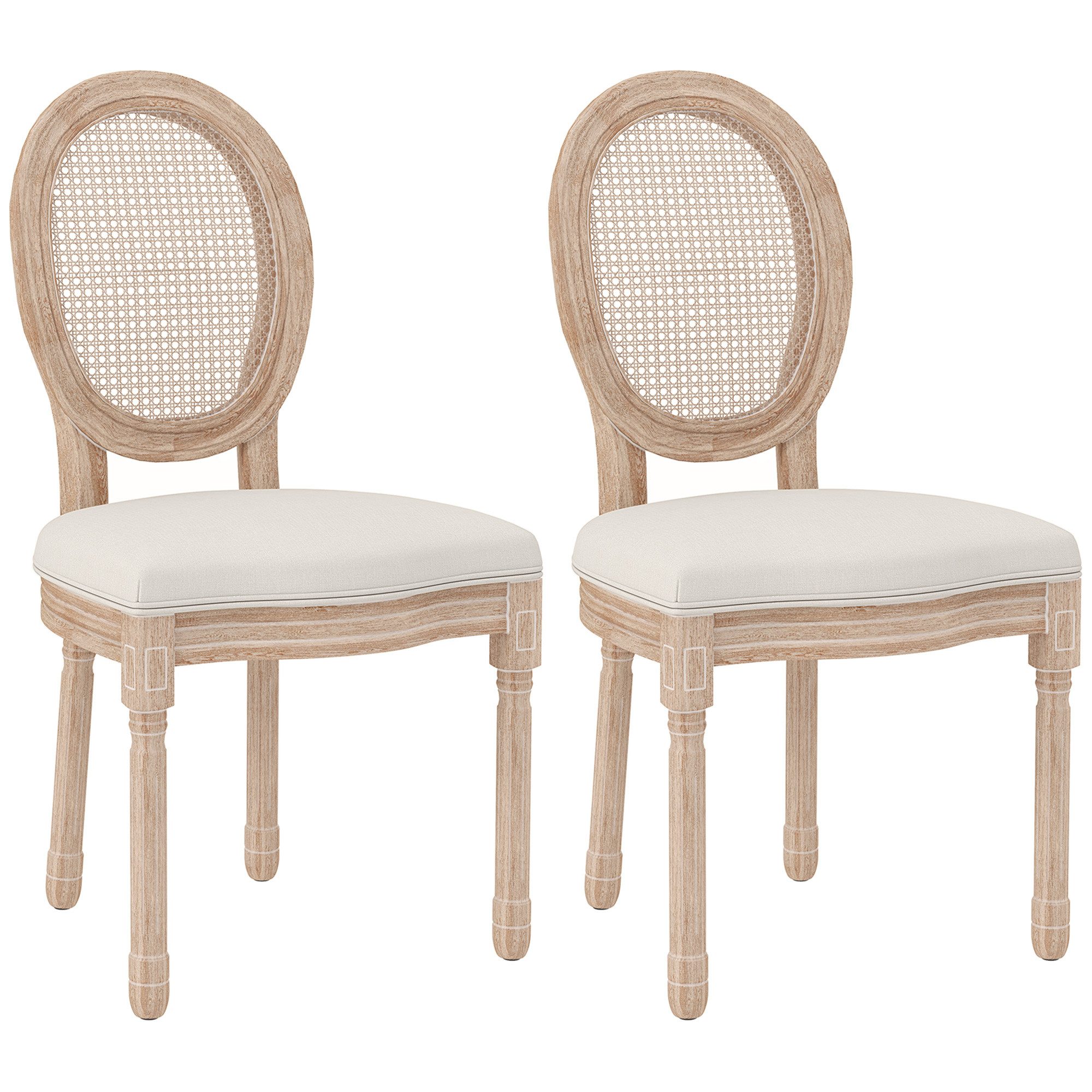 ● Im 2er-Set Esszimmerstühle für Esszimmer, Küche oder Wohnzimmer ● Dicke Polsterung mit atmungsaktivem Stoff in Leinenoptik und Rückenlehne aus Rattan für zusätzlichen Komfort ● Französischer Vintage-Charme mit weiß gebürstetem Holz und gedrechselten Beinen zur Dekoration ● Beine des Küchenstuhls aus massivem Gummibaumholz für einen sicheren Stand ● Verstellbare Fußkappen, die an den Beinen befestigt sind, sorgen für einen stabilen Stand ● Geeignet für Esszimmer, Küche, Schlafzimmer und mehr ● Montage erforderlich