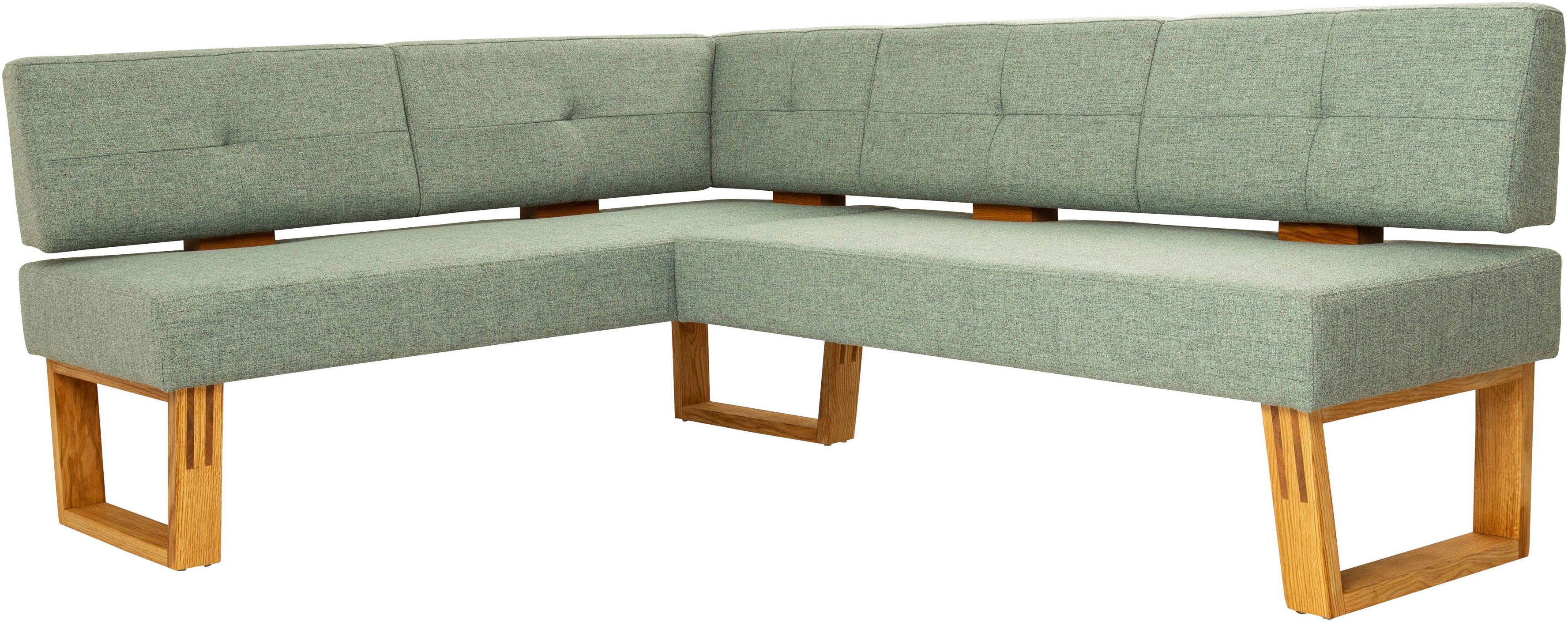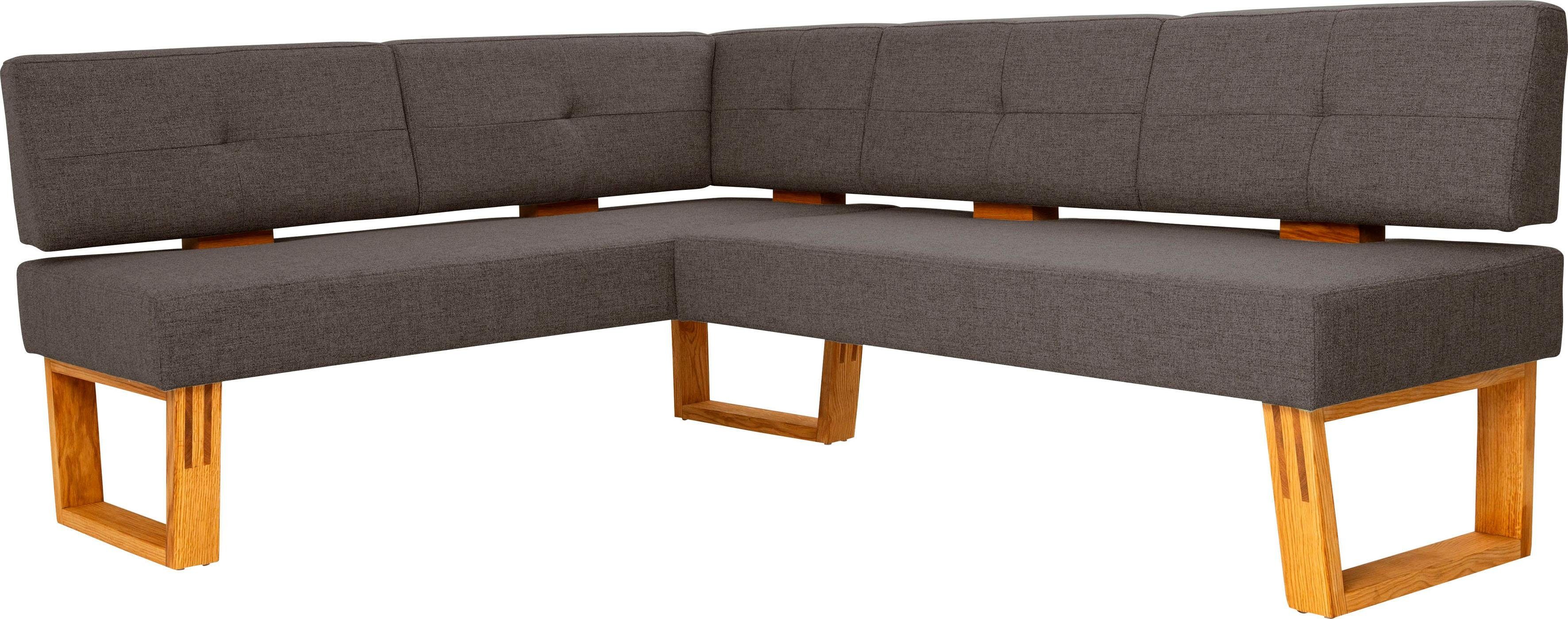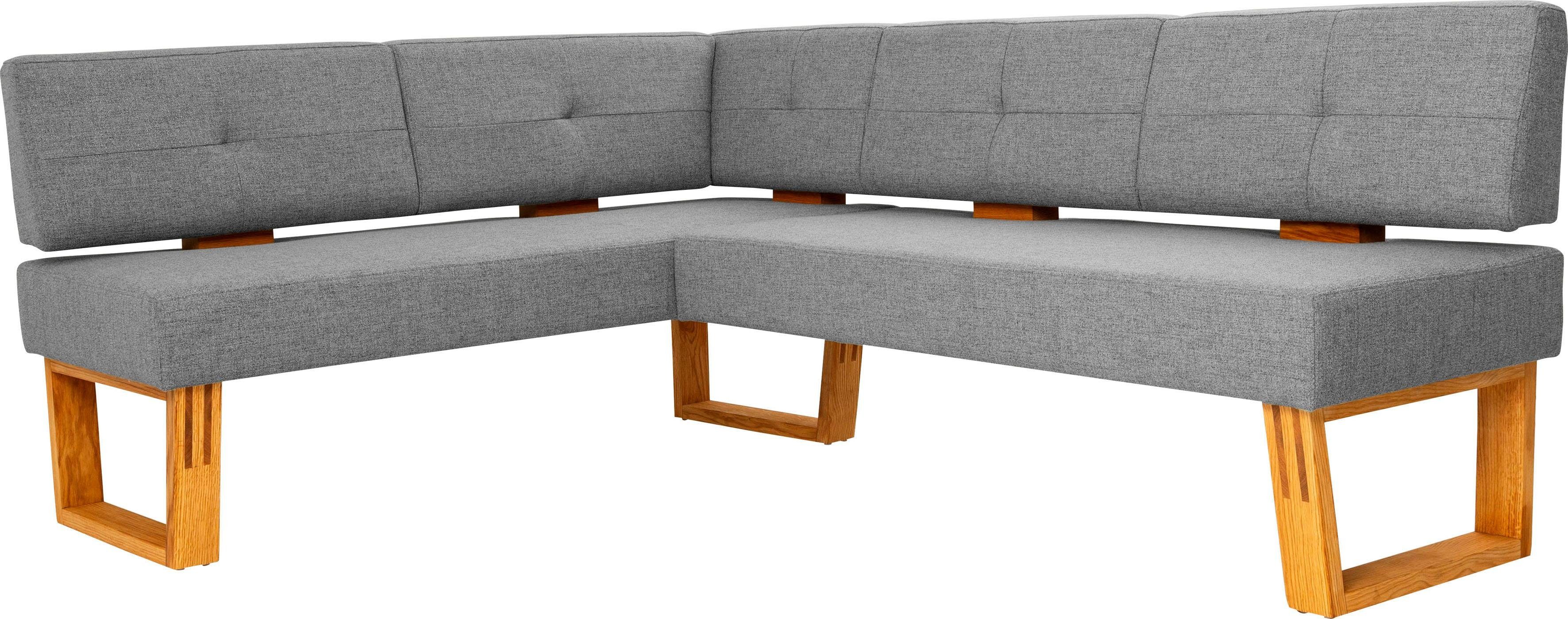 Wissenswertes | Polster-Eckbank mit Beinen und Rückenträger aus FSC zertifizierter Eiche geoelt, das Gestell ist aus FSC zertifiziertem Holzwerkstoff und Massivholz. Die Aussenmasse der Eckbank sind (B/T/H) 201/161/85 cm; die Sitzhöhe ist 48,5 cm und die Sitztiefe 45. Der Sitz und Rücken ist bezogen mit strapazierfähiger Strukturstoff im verschiedenen Farben. Die Eckbank hat eine tolle Optik. Die Eckbank kann Frei im Raum stehen. Все Maße sind ca.-Maße. Produkt kommt zerlegt. Details: