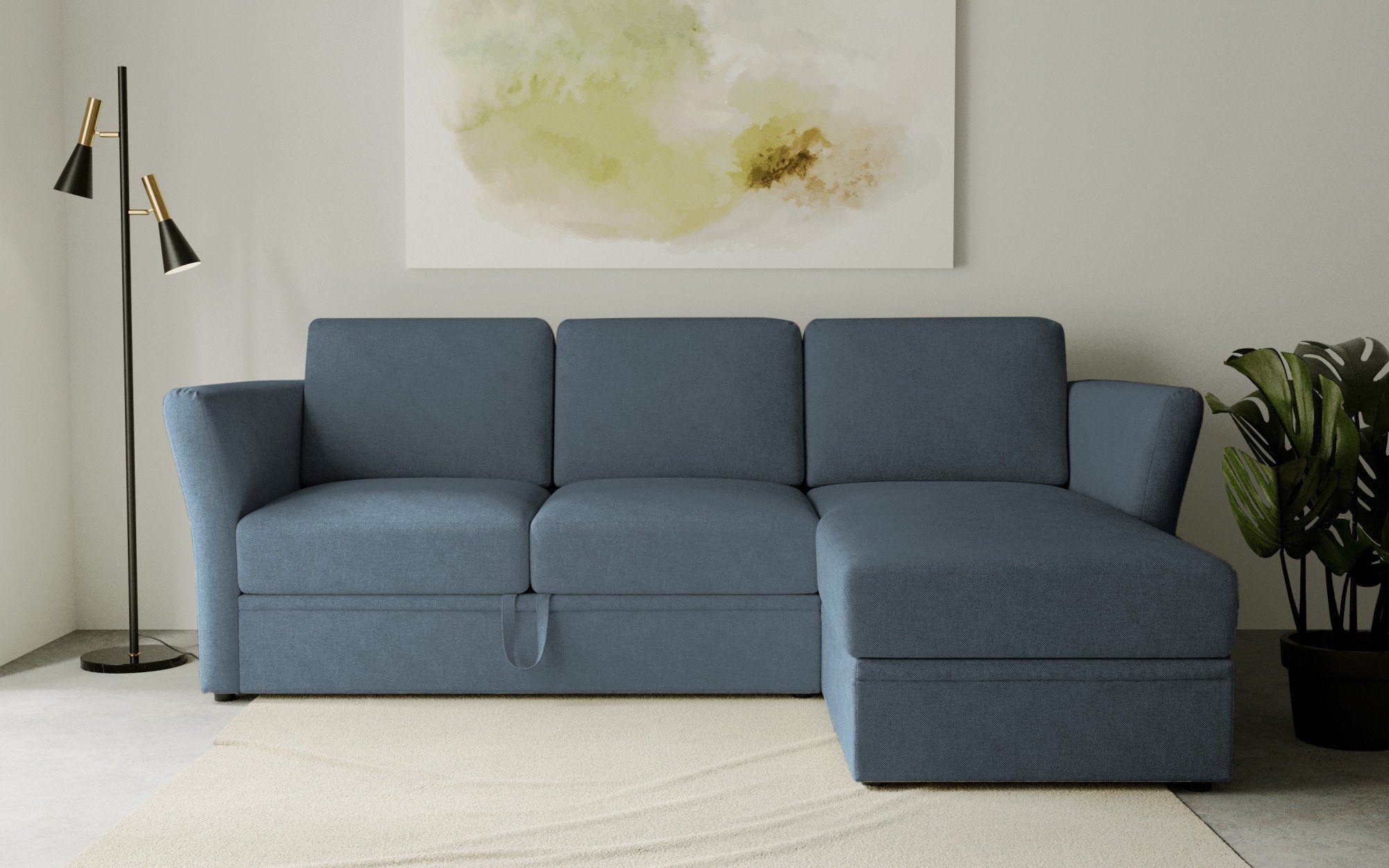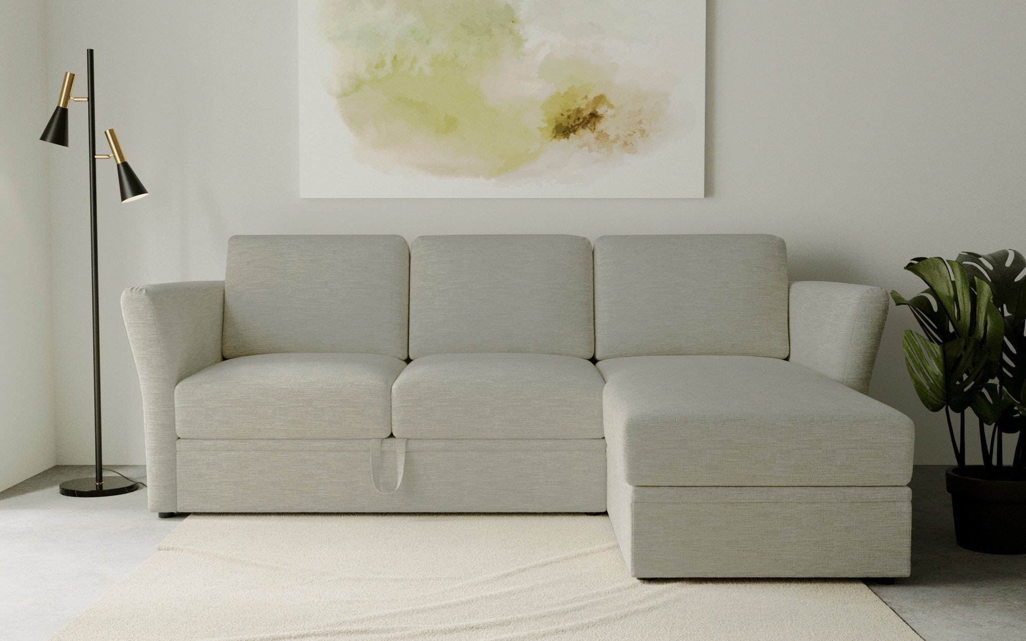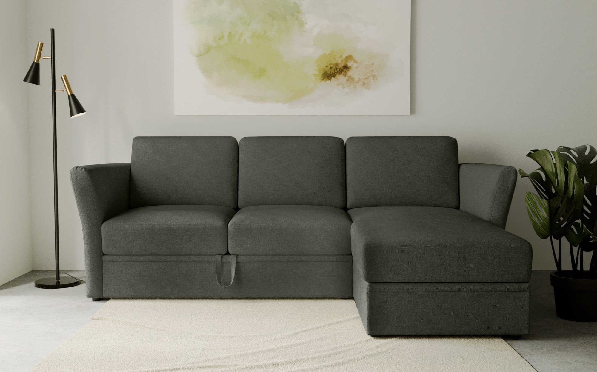 Wenn du Wert auf bequeme und langlebige Sitzmöbel legst, solltest du einen Blick auf dieses Ecksofa »Lavars, L-Form, Schlafsofa« von Home affaire werfen. Er ist mit hochwertigem PUR-Schaumstoff gepolstert. Darüber hinaus handelt es sich hierbei um ein echtes Platzwunder, da es mit einer ausziehbaren Liegefläche versehen und somit Schlaf- und Ruhezone in einem ist. Beim Ecksofa befindet sich die Recamiere, von vorne betrachtet, auf der rechten Seite. Belastbar ist dein neues Möbelstück bis zu 360 Kilogramm. Der Bezug aus Webstoff besitzt keine abstehenden Fasern und sorgt für eine glatte und ebenmäßige Oberfläche.