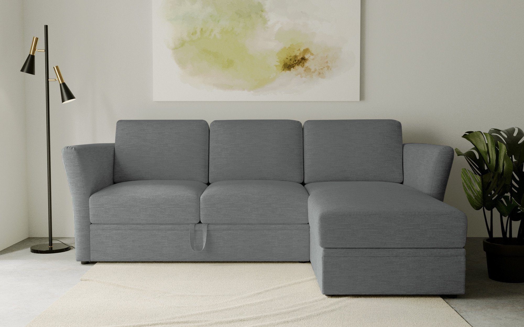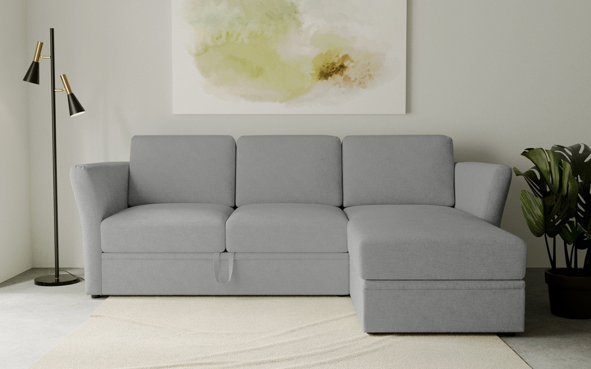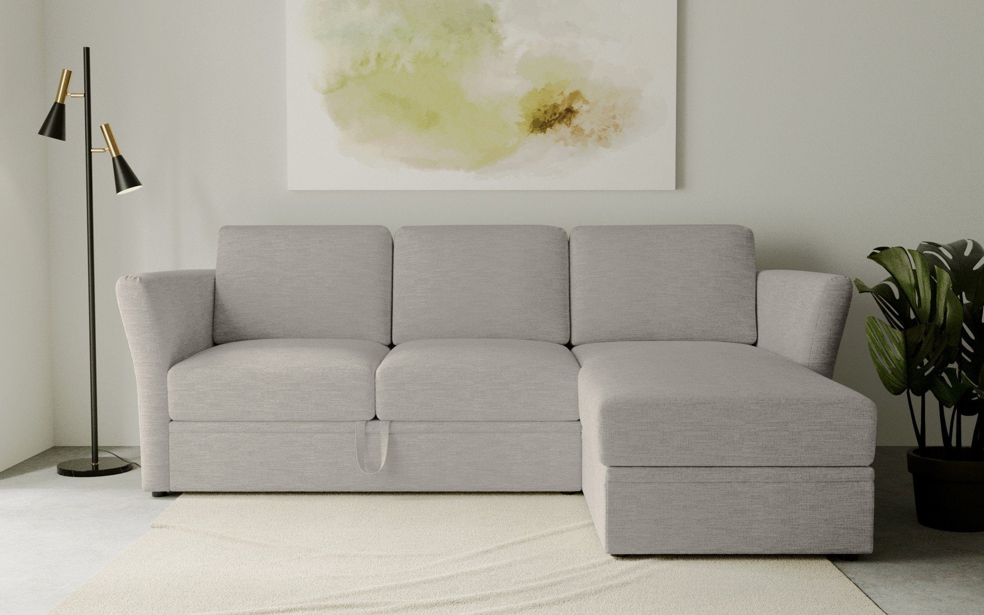 Wenn du Wert auf bequeme und langlebige Sitzmöbel legst, solltest du einen Blick auf dieses Ecksofa »Lavars, L-Form, Schlafsofa« von Home affaire werfen. Er ist mit hochwertigem PUR-Schaumstoff gepolstert. Darüber hinaus handelt es sich hierbei um ein echtes Platzwunder, da es mit einer ausziehbaren Liegefläche versehen und somit Schlaf- und Ruhezone in einem ist. Beim Ecksofa befindet sich die Recamiere, von vorne betrachtet, auf der rechten Seite. Belastbar ist dein neues Möbelstück bis zu 360 Kilogramm. Der Bezug aus Webstoff besitzt keine abstehenden Fasern und sorgt für eine glatte und ebenmäßige Oberfläche.