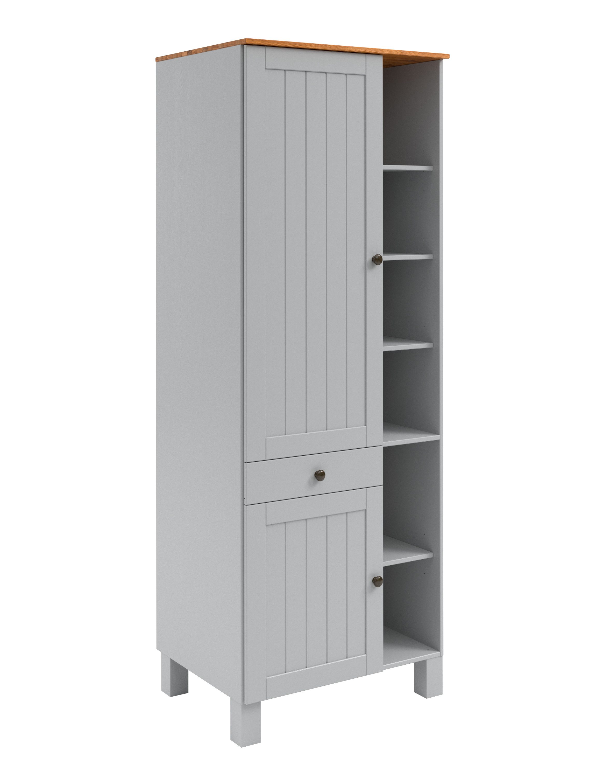 Rustikal und gemütlich zugleich — der Hochschrank im Landhausstil lässt sich gut mit naturbelassenen Hölzern und natürlichen Stoffen wie Leinen, Baumwolle oder Flachs kombinieren. Auflockernde Farbtupfer können beispielsweise mit Deko-Elementen wie bunten Vasen oder Kerzen eingebracht werden. Er gehört zur Alby2 Serie, die weitere Artikel in diesem Stil enthält. So kannst du ein harmonisches Gesamtbild zaubern.